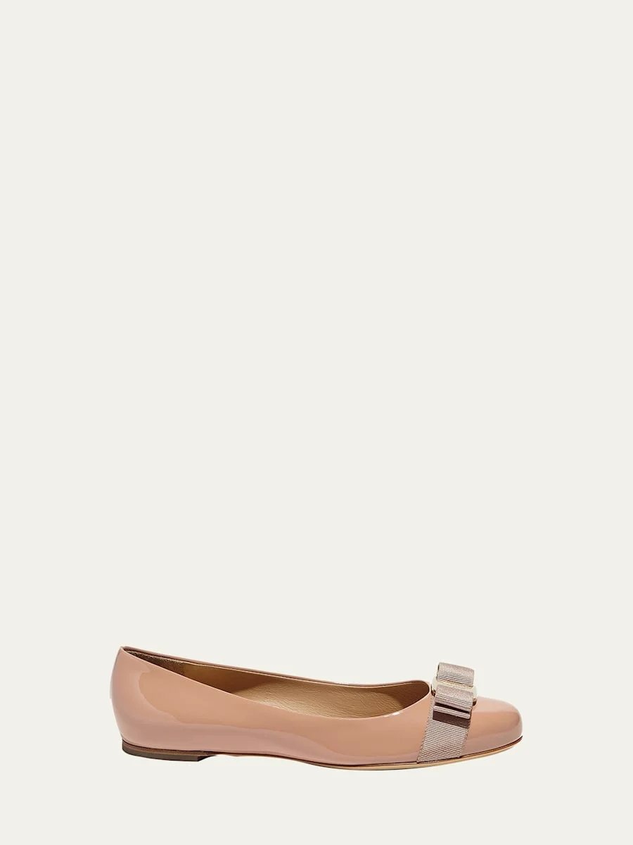 Salvatore Ferragamo "Varina" ballerina flats in patent leather Signature Vara grosgrain bow accent. 0.4" flat heel. Round toe. Slip-on style. Leather sole. Made in Italy. Online Inquiries: BGS21_X58BE| Store Inquiries: #3712487