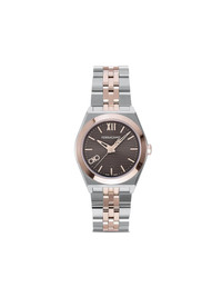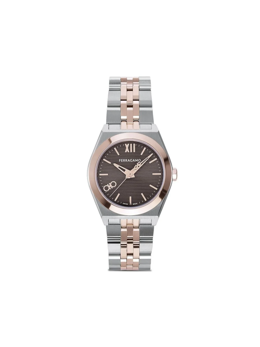 Vega 28mm Highlights - Brown - 28mm - Stainless steel - Round face - Index dial - Baton hands - Gancini plaque - Quartz movement - Quartz movement - Screw-down crown - Adjustable link bracelet - Folding clasp - This item comes with a standard one-year warranty from the boutique. Imported SIZE & FIT Measurement CIRCUMFERENCE 1.1 in(2.8 cm)