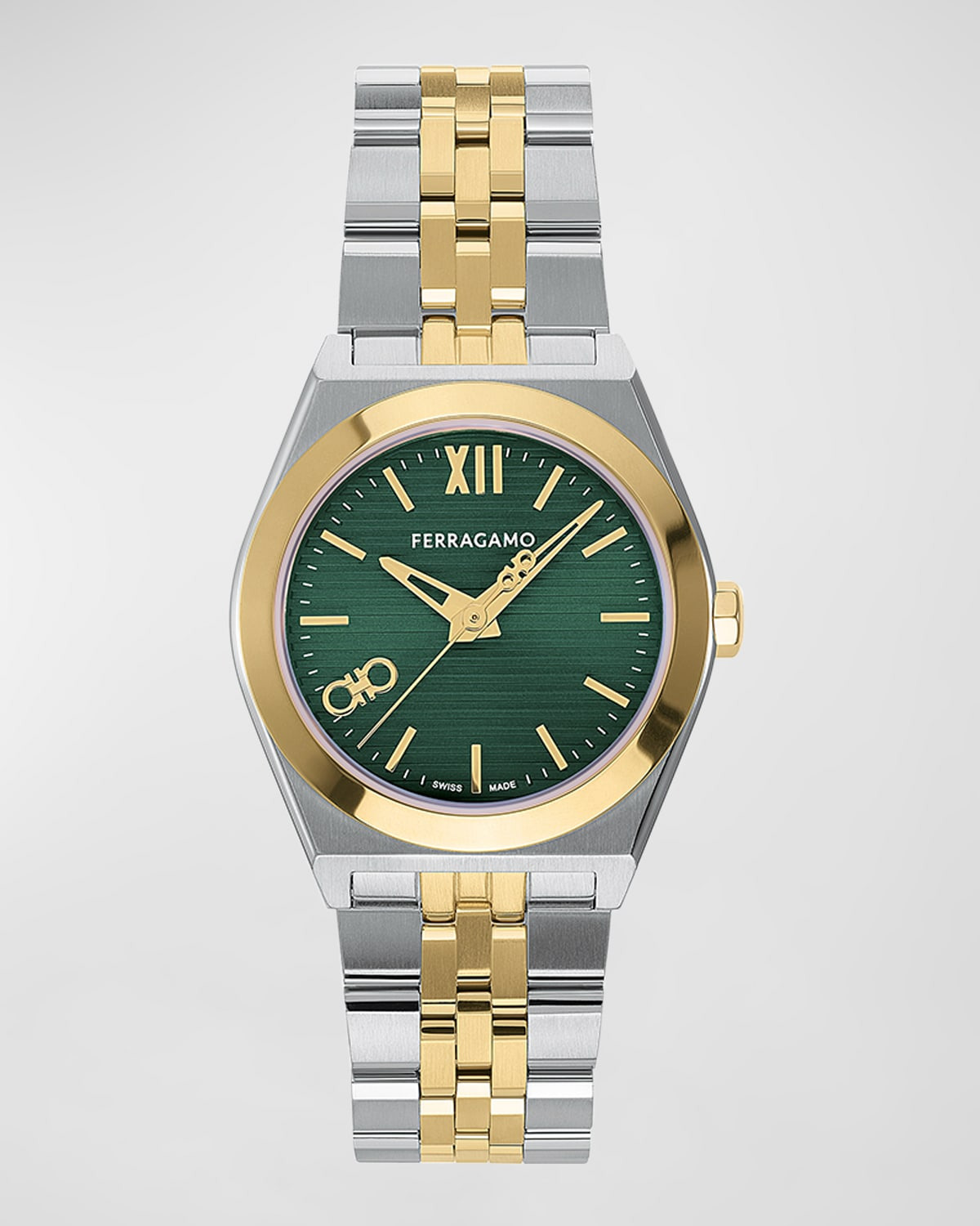 - Vega New watch by Ferragamo - Case dimensions: approx. 28mm - Approx. 6.4" length x 0.6" width - Two-tone stainless steel case - Green guilloche dial with baton indices - Roman numeral at the 12 o'clock index - Gancini logo as the 8 o'clock marker - Bracelet strap with a deployant buckle - Three-hand quartz movement - Spot clean - Made in Switzerland
