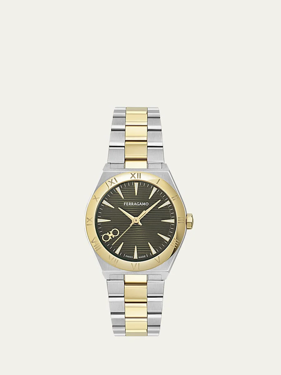 Ferragamo bracelet watch Approx. 6.4" length x 0.6" width Case dimensions: approx. 28mm Stainless steel with a two-tone finish Bezel features embossed Roman numerals Guilloche dial with batons and double Gancini Three-link bracelet strap; butterfly closure Three-hand quartz movement Water resistant to 5 ATM Sapphire crystal window Spot clean Made in Switzerland Online Inquiries: BGS21_Y7HWZ| Store Inquiries: #5019433