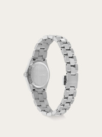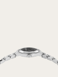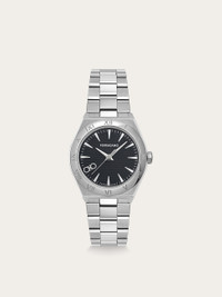 The Ferragamo Vega Upper East watch is a timeless pair that exudes classic elegance and sophistication. Designed as a pair watch, a 40mm model for men and a 28mm model for women. Both timepieces feature the signature Vega shape, a hallmark of enduring design. The top ring is adorned with intricately engraved Roman numerals, adding a touch of vintage charm to the contemporary design. Size: 28 mm Movement: RONDA 763-3 hands quartz Case: Stainless Steel - Crown with embossed “F” Dial: Black sunray guilloche applied indexes and Double Gancini at 8h Bracelet: Stainless Steel bracelet - Butterfly buckle with Ferragamo logo Glass: Sapphire crystal, anti-reflection, scratch-resistant WaterResistance: 30 meters 2+2 Year Warranty Outer box, packaging, warranty and instruction booklet - Composition: Stainless Steel Case and Bracelet - Made in SWISS - Product code: 611287 784384
