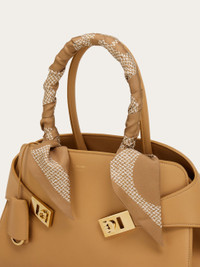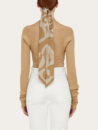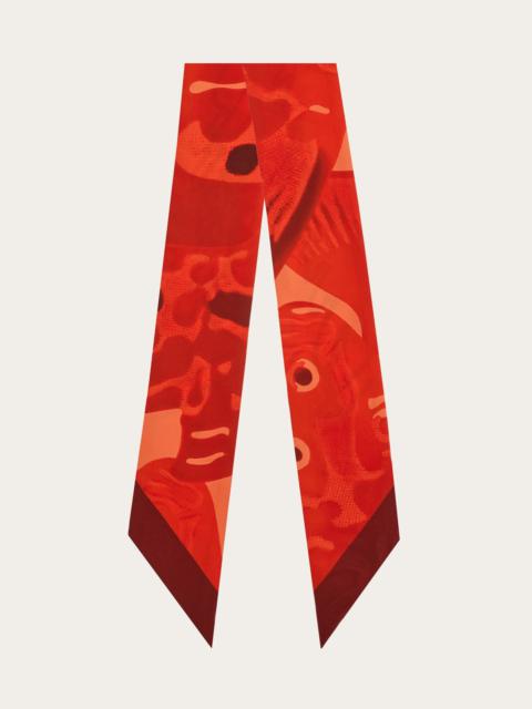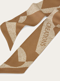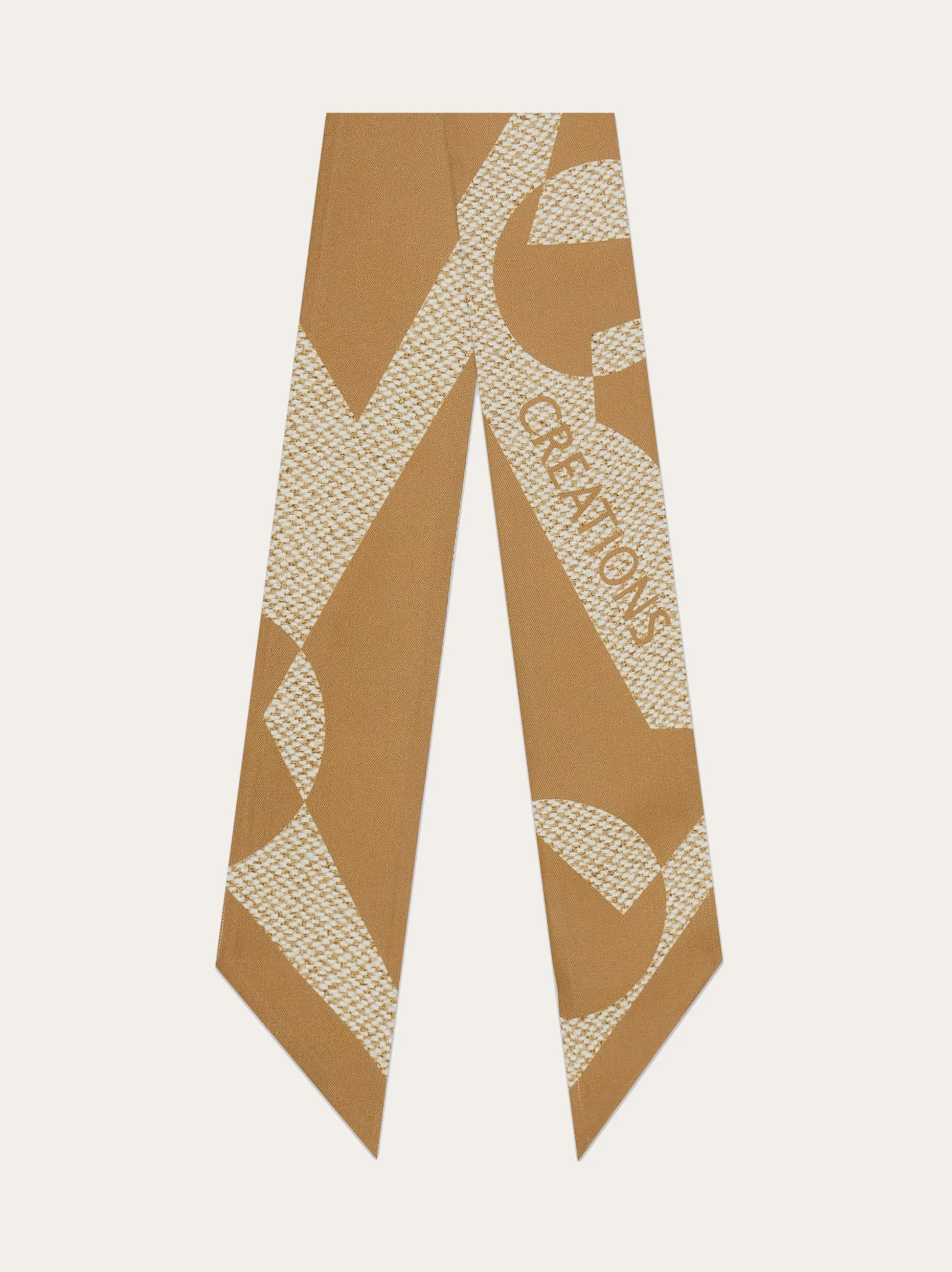 A most versatile accessory, the silk bandeau can be worn in your hair, around your neck, as a belt, or used to decorate your bag; the options are endless! This iteration is decorated with the Venna print, a stylized logo designed by artist Lucio Venna for Ferragamo in the 1930's. - length 55.1 IN width 2.7 IN - Composition: 100% silk - Made in ITALY - Product code: 321116 783717