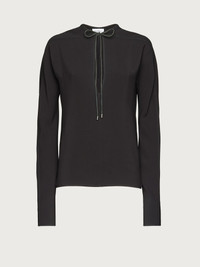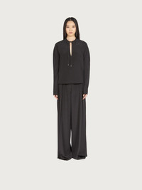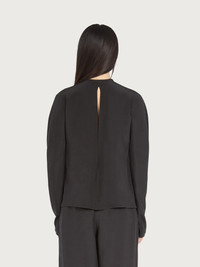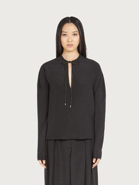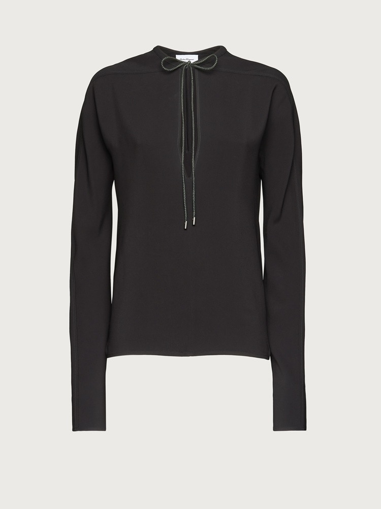Long sleeve blouse cut from cady viscose with a soft, fluid feel. The relaxed fit features a deep teardrop opening on the front at back, for a sensuous detail. The neckline can be closed with a woven tassel ribbon, a luxurious detail that echoes the Ferragamo skill in leather processing. Model measurements: Height 5' 9½"/176 cm; Bust 30½"/78 cm; Waist 23"/58 cm; Hips 34 "/88 cm Worn size: 38 - Composition: 100% viscose - Made In ITALY