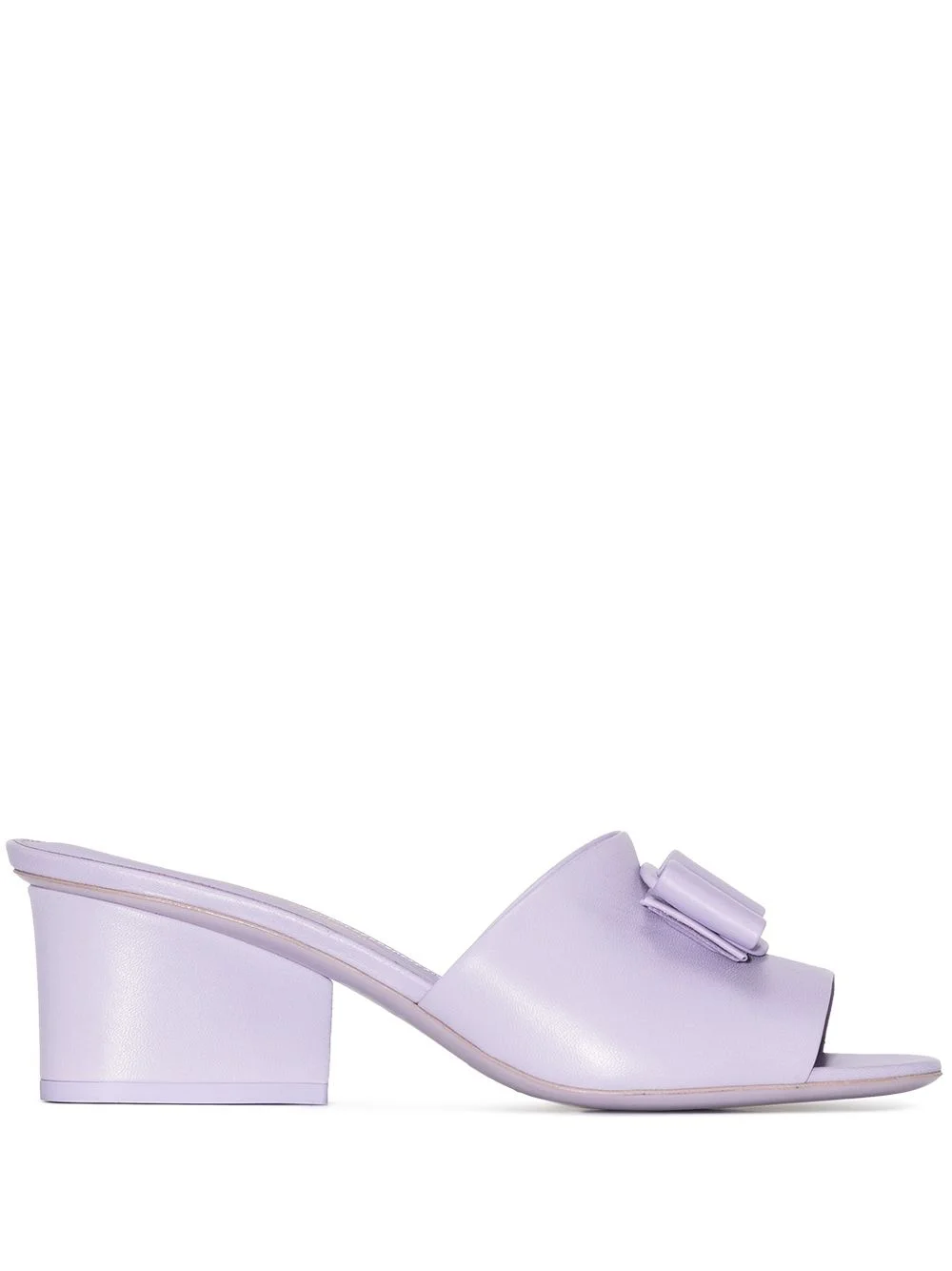 Viva Bow 55mm leather sandals Set atop a stable block heel, these mules from Salvatore Ferragamo are a comfortable take on timeless elegance. For added practicality, this pair is designed in a slip-on style and accented with a signature Viva Bow for a luxurious finish. Highlights - Lilac purple - Leather - Signature vara bow detail - Branded insole - Open toe - Slip-on style - Mid block heel Made in Italy Composition Sole: Leather 100% Outer: Leather 100% Lining: Leather 100% SIZE & FIT Model measurements Height 5 ft 10 in(1.78 m) Bust/Chest 30.7 in(78 cm) Hips 33.85 in(86 cm) Waist 22.44 in(57 cm) FittingInformation This piece fits true to size. We recommend you get your regular size Measurement HEEL 2.16 in(5.5 cm)