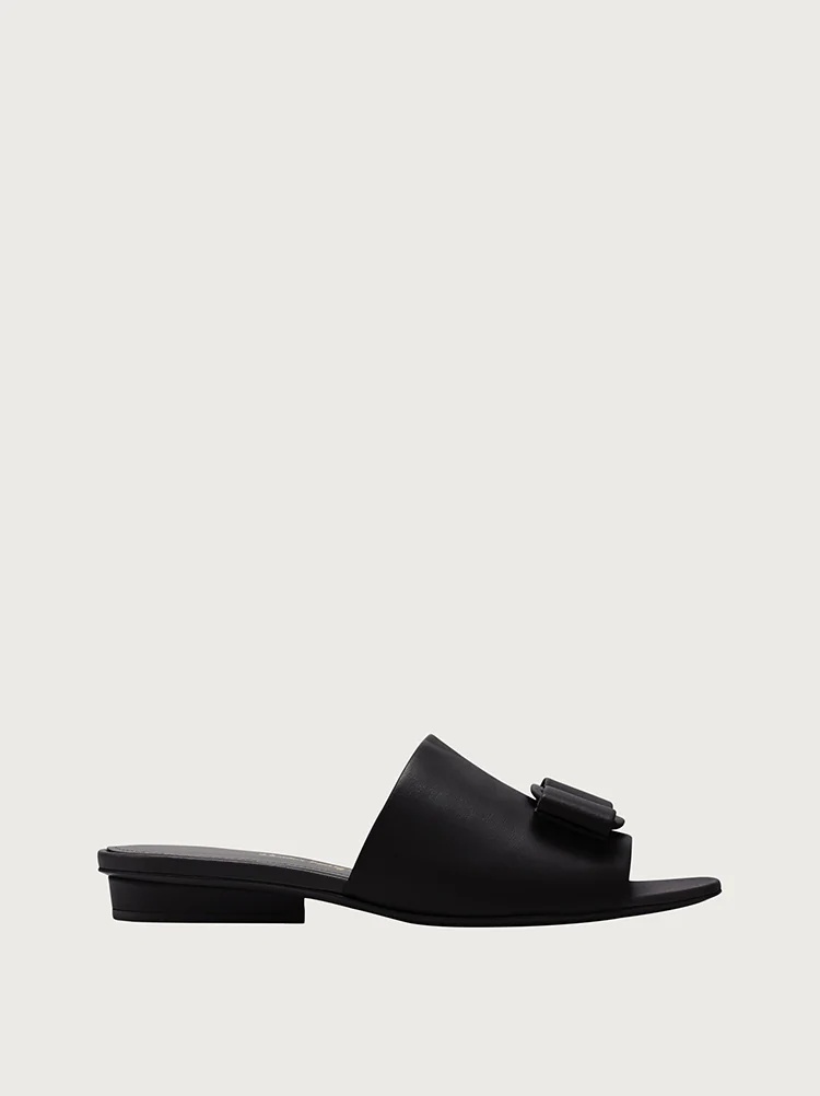 New entry to the Viva collection that will have your inner diva ready to hit the pool. Nappa slide with a smooth texture and sophisticated, feminine lines. The iconic Vara bow that graces the toe has been given new proportions for a modern touch. The metal plaque has an embossed Ferragamo signature to mirror the entire Viva collection, a new wave of modern masterpieces, made exclusively for the contemporary woman. The teardrop heel is inspired by the sinuous sculptures of Richard Serra. - Heel 3 cm - Composition: Nappa leather - Made In ITALY