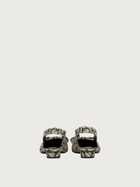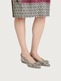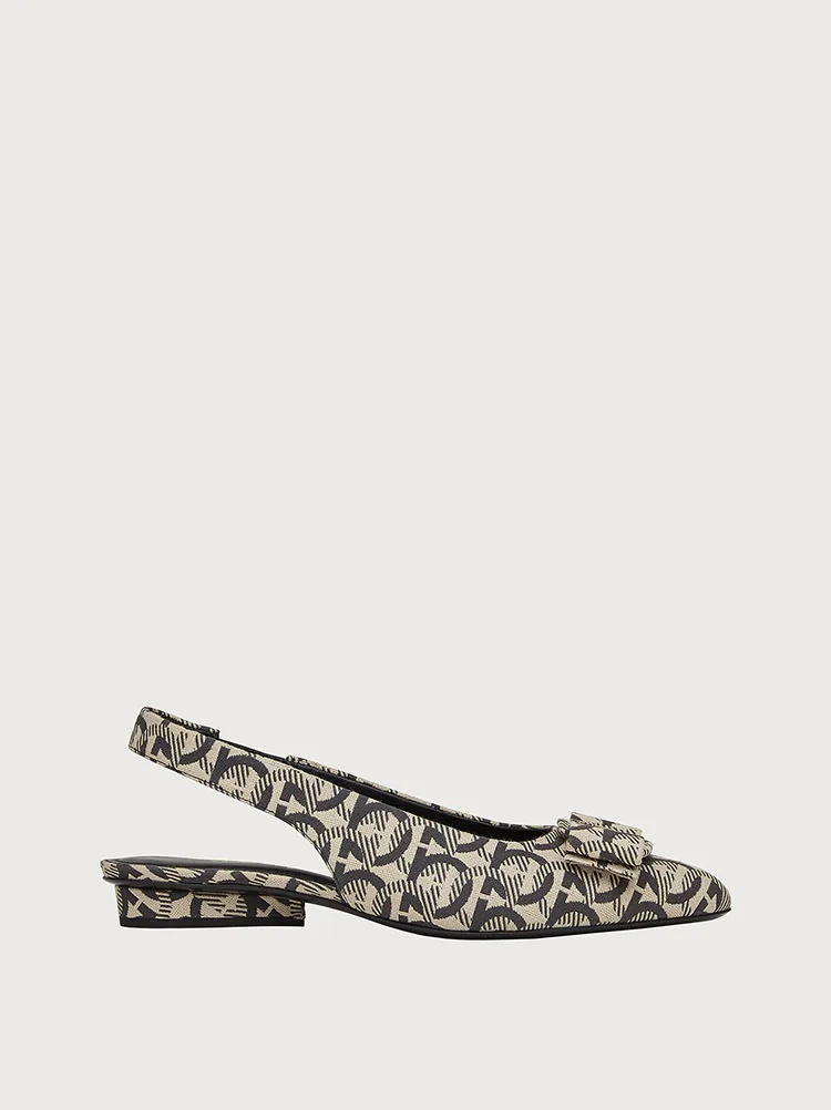 Viva is a new exciting Ferragamo icon. This slingback is the ideal blend of practicality and feminine style, resulting in a glam shoe with avant garde lines. Made of jacquard with a Gancini woven pattern, it has a tapered tip, a slightly closed neckline and an oversize tassel bow. The tonal painted metal plate and the signature in relief add a metropolitan twist. Elastic side insert and heel with teardrop silhouette, inspired by the sculptures of Richard Serra. - Heel 2 cm - Composition: Fabric - Made In ITALY