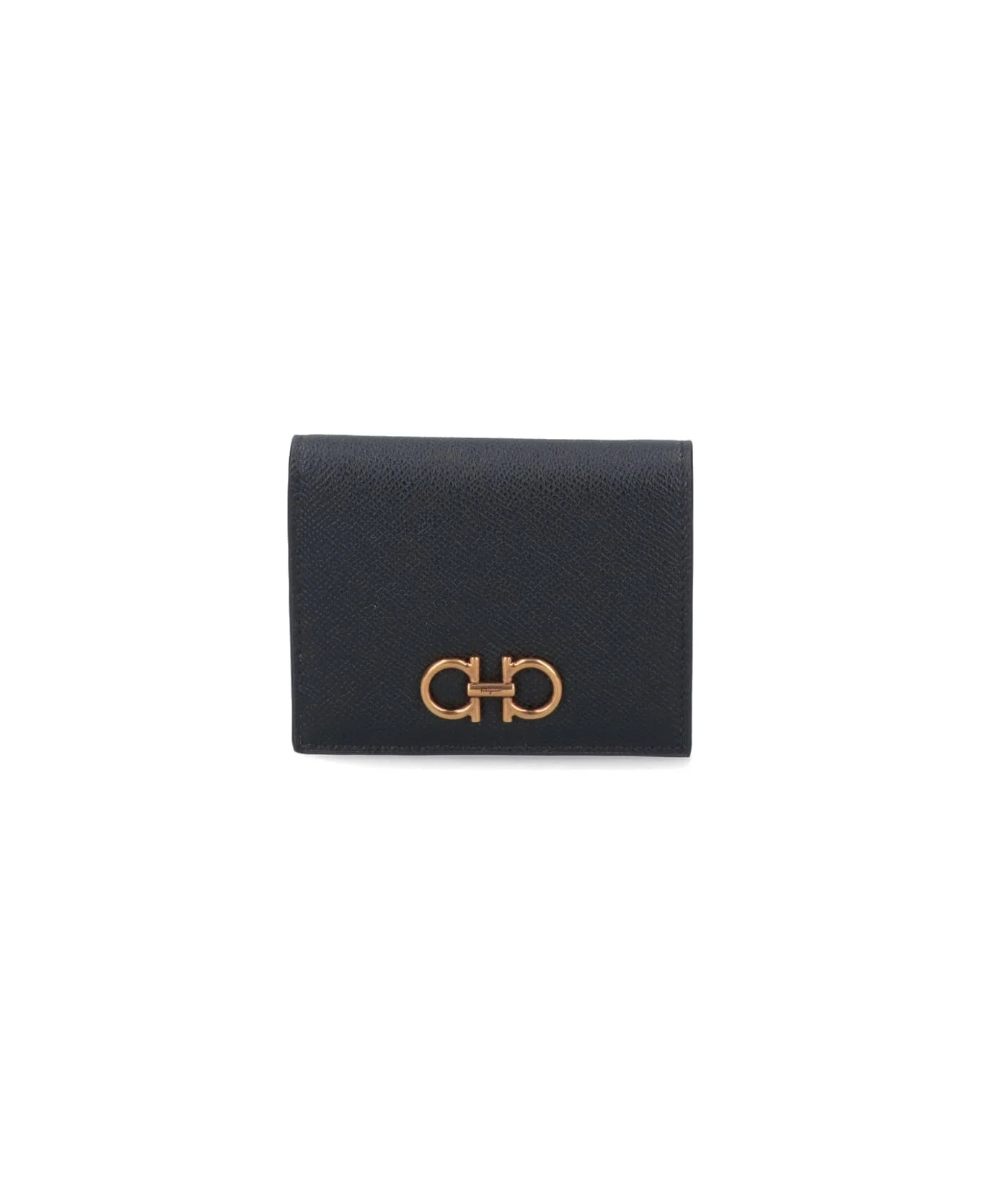 Ferragamo 'gancini' wallet, black leather, snap button closure, gold metal logo at the front, an inner coin pocket, an inner bill compartment, two inner flat pockets, and three card slots. Made in: Italy Color: Black Size and fit: - Height 9.0 CM, Length 11.3 CM Model number: 726512001