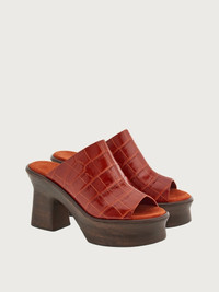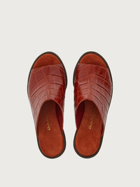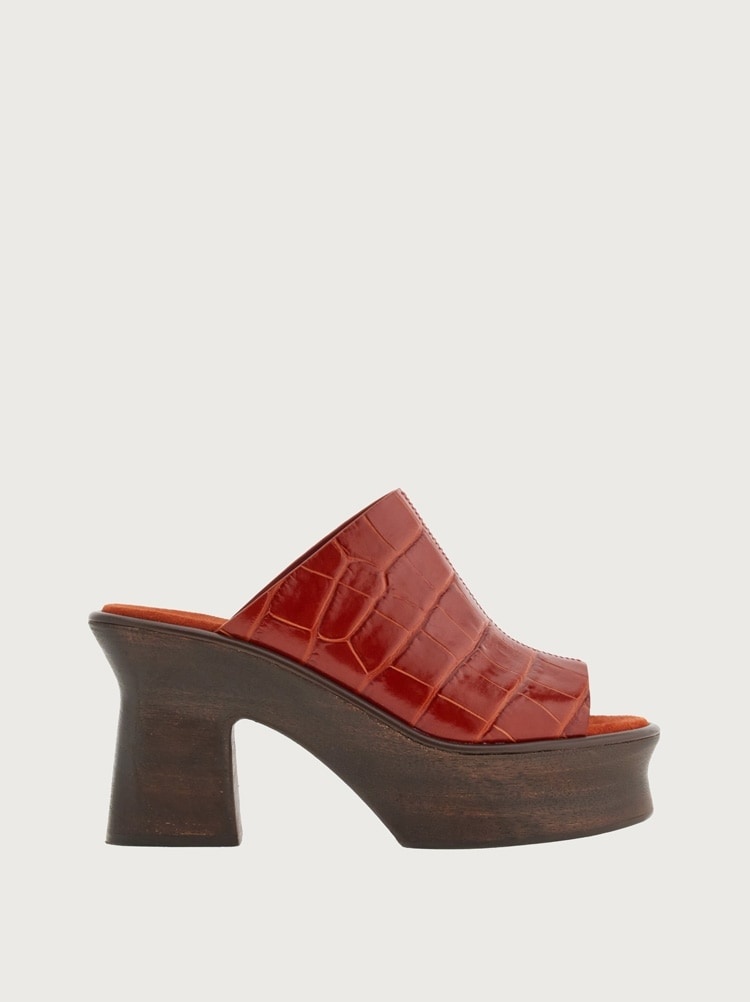 Seventies style meets modern production methods and Ferragamo creativity in this cool new wedged sandal made from ultra-light wood. The wide foot strap is made from calf leather with a croc print and a raised central seem for a strong look. The shape of the wedge echoes this season’s vibe, a mix of sophistication and contemporary glamour. - Heel 8,5 cm - Composition: printed calf leather - Made In ITALY
