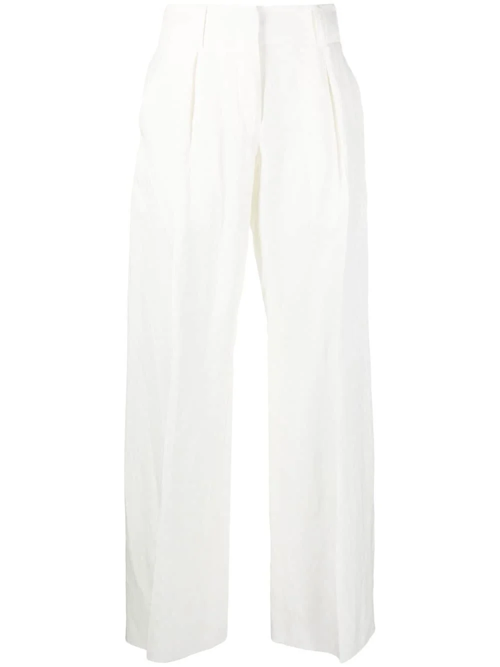 wide-leg trousers Celebrating Ferragamo's timeless aesthetic, these wide-leg trousers arrive in a fresh white hue and are complemented by classic pleat detailing. Made in Italy Composition Silk 75%, Linen/Flax 25% SIZE & FIT Model measurements Height 5 ft 9 in(1.75 m) Bust/Chest 31.1 in(79 cm) Hips 33.46 in(85 cm) Waist 23.22 in(59 cm) FittingInformation This piece fits true to size. We recommend you get your regular size Designed to be fitted at the waist and hips, loose over the leg Made with a lightweight non-stretch fabric Washing instructions Dry Clean Only