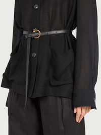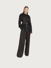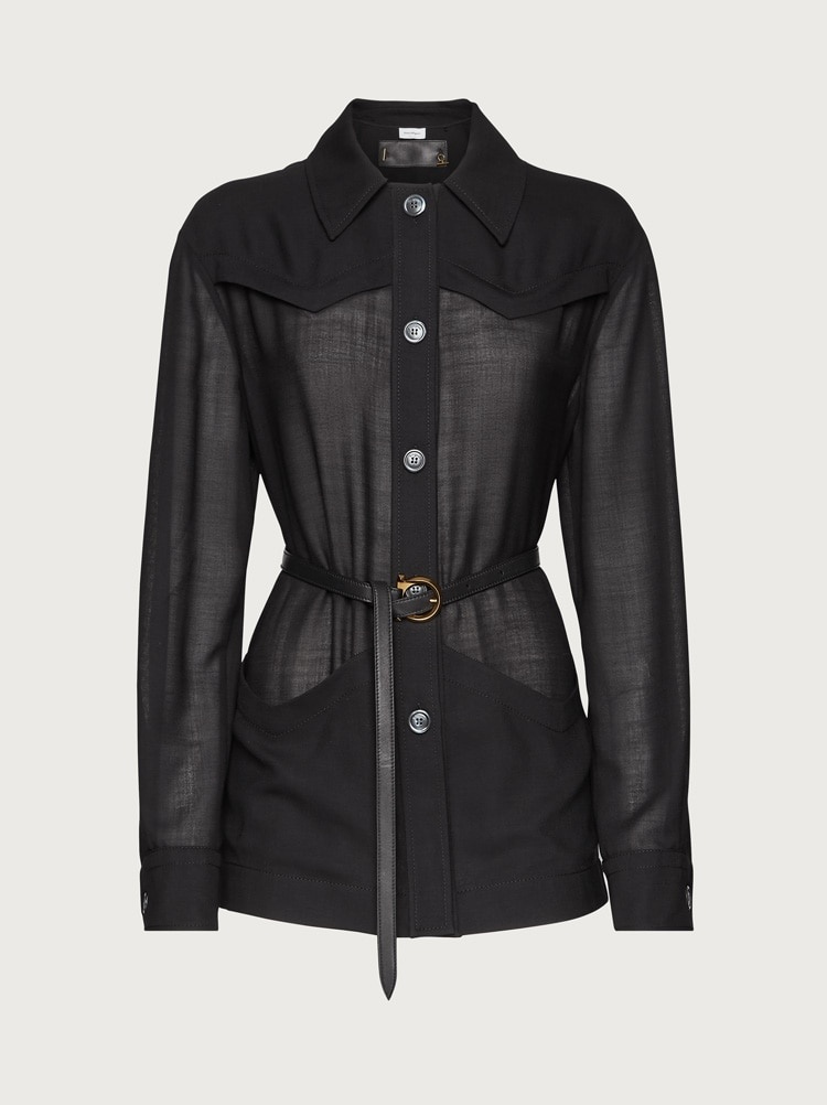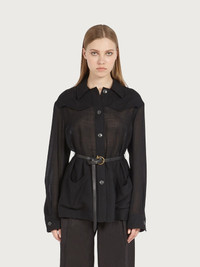 Inspired by the lines of the Saharan jacket, this model is composed in a sensual key cut from wool gauze with a semi-transparent effect. The construction features a shaped and stitched shirt collar and yoke, both front and back. The macro patch pockets fall softly on the hips, emphasizing a laid back feel. The shape cinches at the waist via a leather belt with golden Gancio buckle. The wool derived from responsible sources with high standards of animal welfare and land stewardship. - Composition: 85% pure virgin wool, 15% polyamide - Made In ITALY