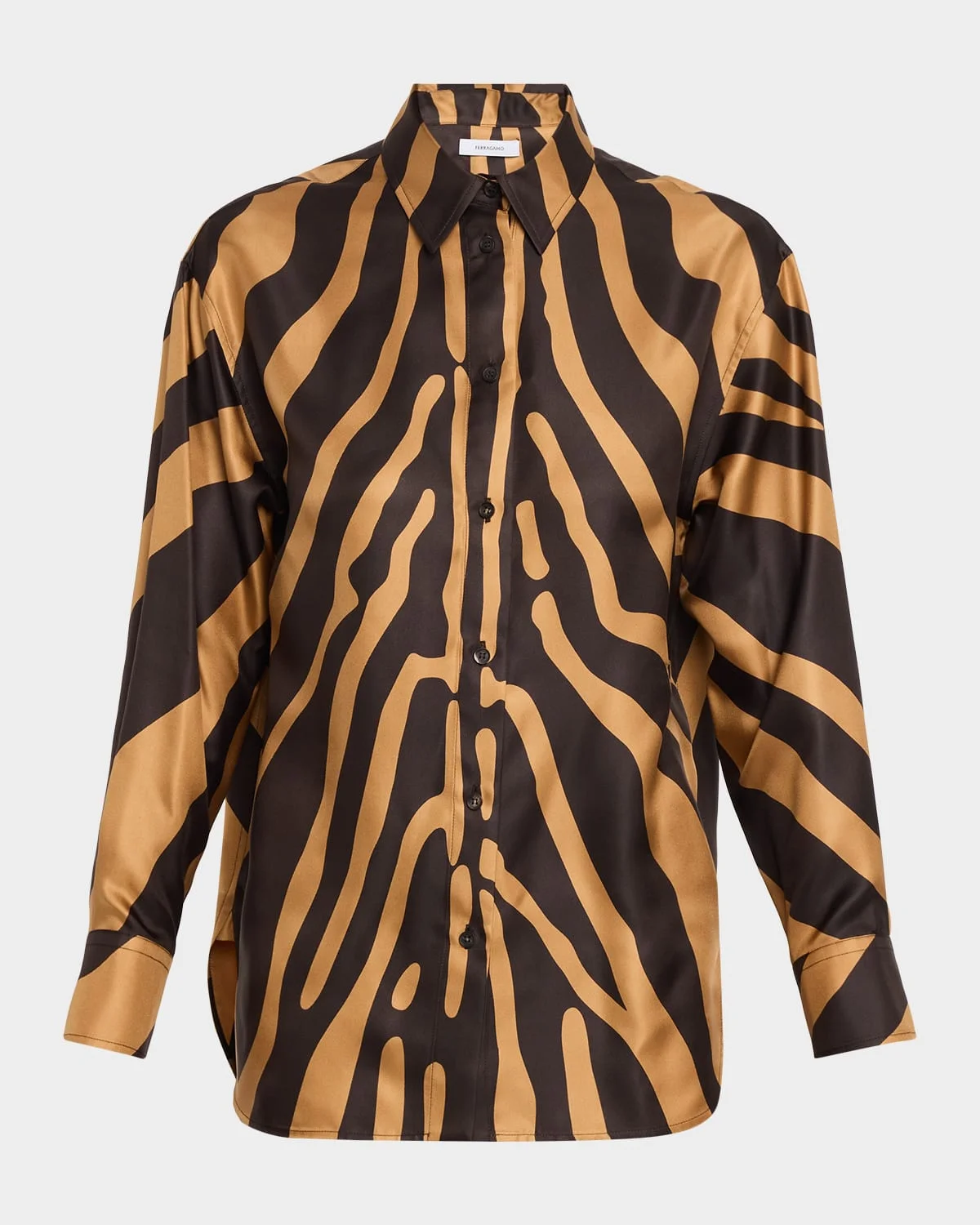 Crafted from lustrous silk twill, this shirt from Ferragamo features a zebra print Point collar; button front Long sleeves; button cuffs Loose fit Shirttail hem Silk Made in Italy SIZE & FITModel measurements: 5 & apos;10" tallModel is wearing a US size 4/Small