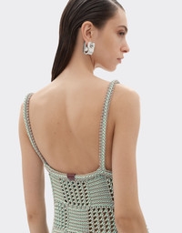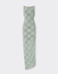 This long dress in a cotton blend lightly reinterprets the iconic 7x7 check, transforming it into a two-tone jacquard motif with a distinctive openwork effect. The side slit, accented by a contrasting grosgrain ribbon, and the open back lend the silhouette a sophisticated allure. DETAILS - Long silhouette - Round neck - Half-length back - Ferrari rear window on the back - Two-tone 7X7 check pattern - Side slit with contrasting grosgrain ribbon MATERIALS PR: CO-TE:70.0 Product Code: 50123f179