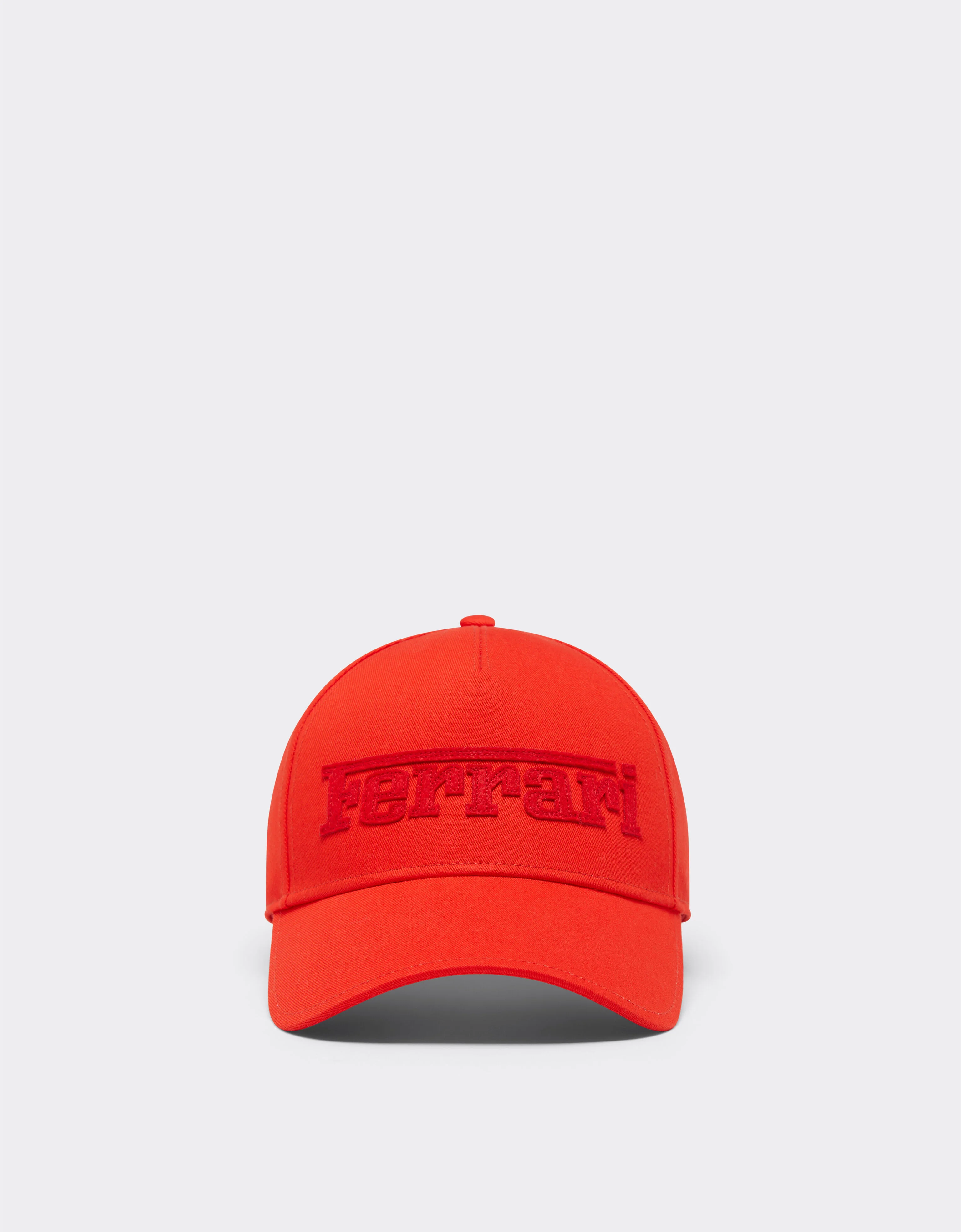 Baseball cap in cotton twill customised with a felt applique with embroidered Ferrari logo on the front panel. The design is completed with tonal stitching and adjustable Velcro fastening with the Prancing Horse detail at the back. An accessory embodying iconic character and a Ferrari wardrobe’s must-have piece. DETAILS - Applique with embroidered Ferrari logo at the front - Tonal stitching - Adjustable Velcro fastening with Prancing Horse detail at the back - Dimension: 57 cm MATERIALS PR: 100%CO Product Code: 21580f112