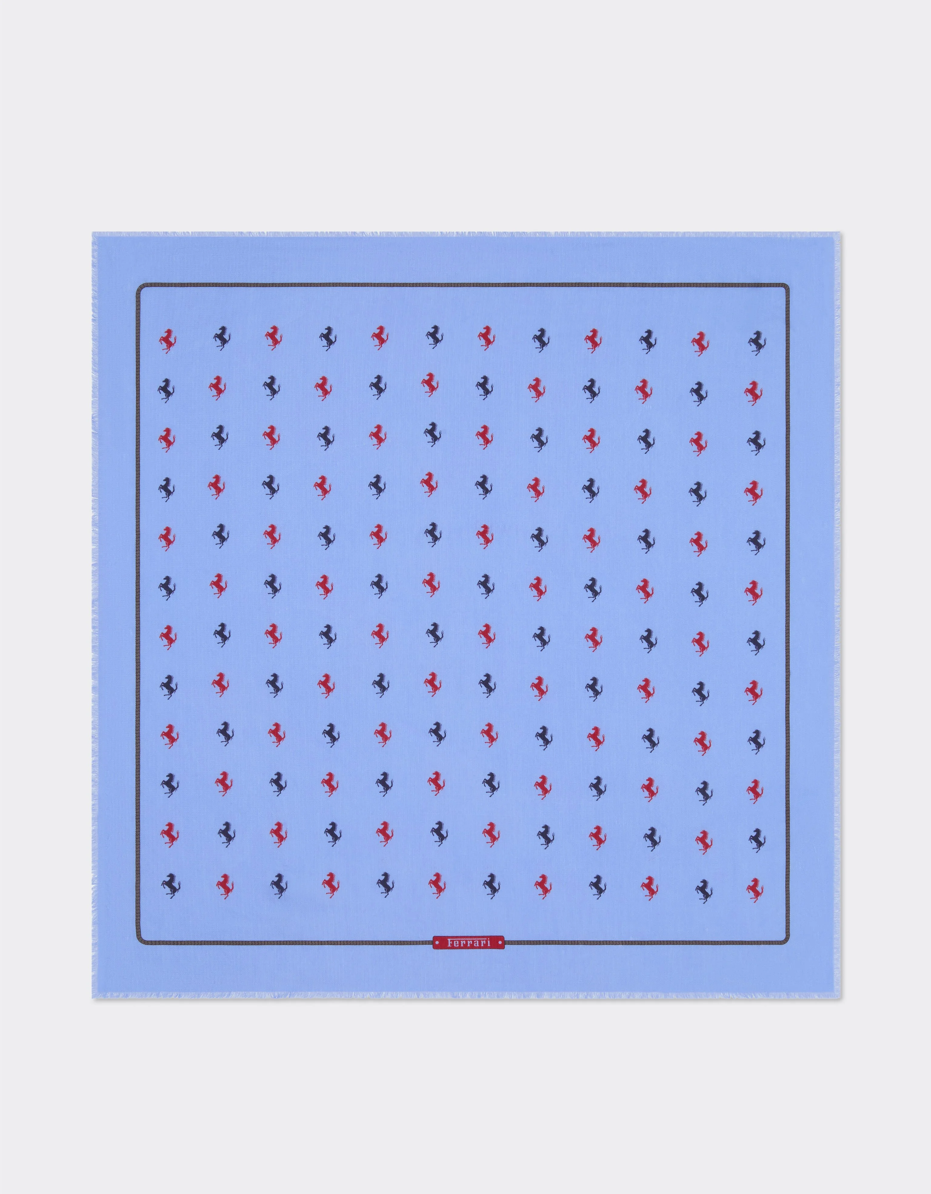 The cotton and silk twill foulard, with jacquard weave and a contrasting shiny and matte effect, reinterprets the concept of lightness by transforming the Prancing Horse into a lively graphic motif. DETAILS - Graphic motif overprint - Frayed motif along the edges - Dimensions: 90 cm x 90 cm MATERIALS PR: SE-TE:64.0 Product Code: 50361f173