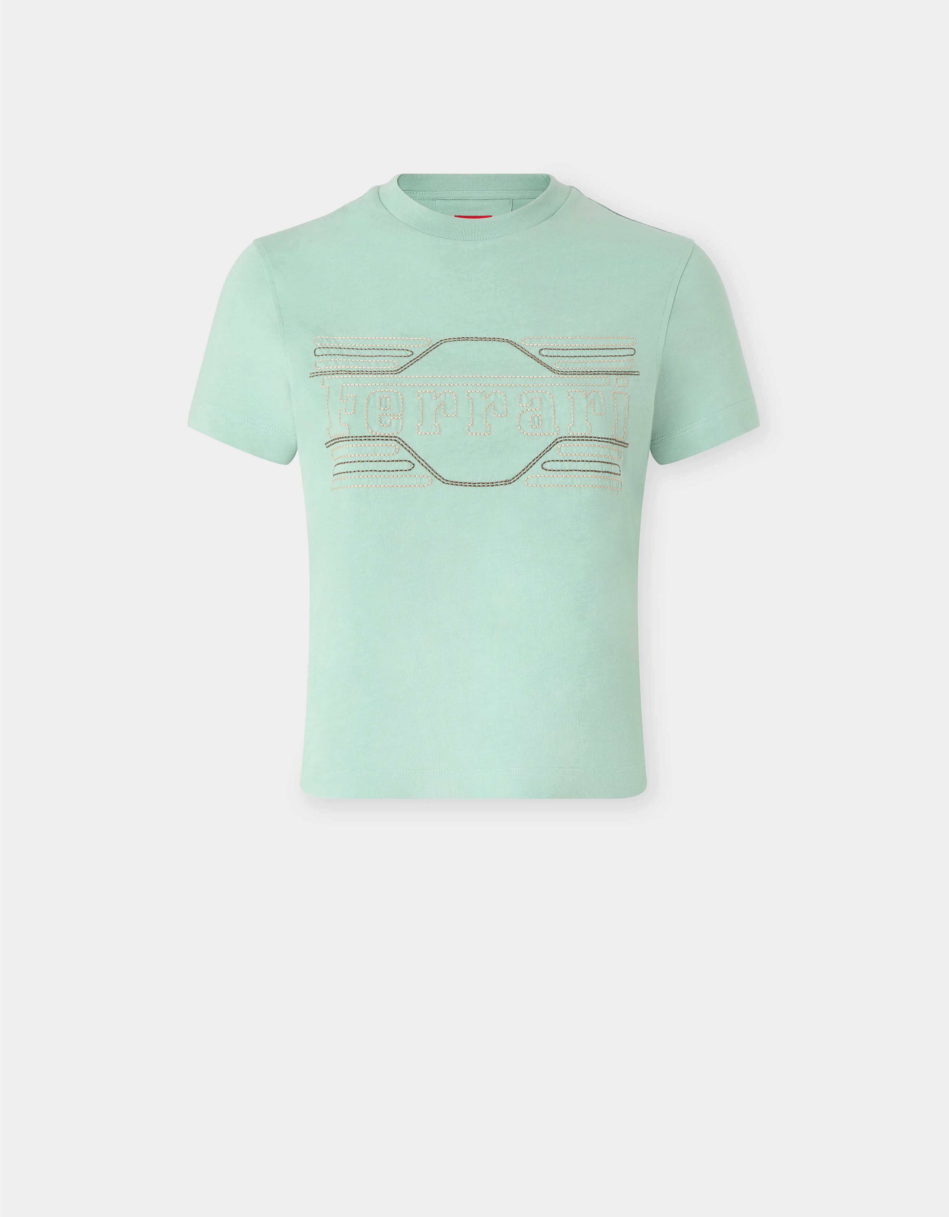 Iconic short-sleeved cotton T-shirt, enhanced by contrasting seasonal Ferrari embroidery on the front and an embroidered insert on the back. The slightly fitted cut enhances the silhouette. DETAILS - Slightly fitted cut - Crew neck - Short sleeves - Contrasting embroidery on the front - Ferrari window on the back MATERIALS PR: CO-TE:100.0 Product Code: 50842f179