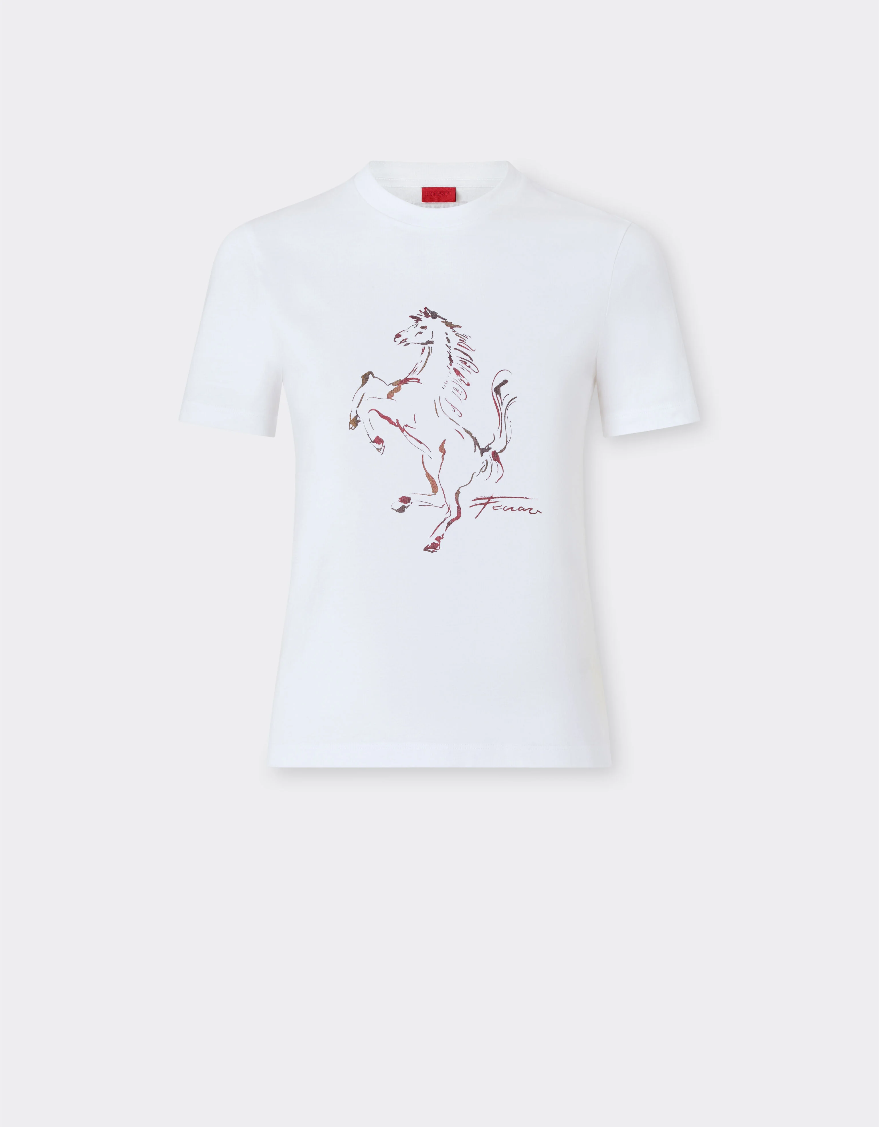 Short-sleeved T-shirt made of cotton and defined by a slightly fitted cut that enhances the silhouette. The watercolour-effect Prancing Horse print on the front adds a distinctive material detail, echoed by the Ferrari logo on the back. DETAILS - Round neckline - Short sleeves - Prancing Horse print MATERIALS PR: CO-TE:100.0 Product Code: 51034f13