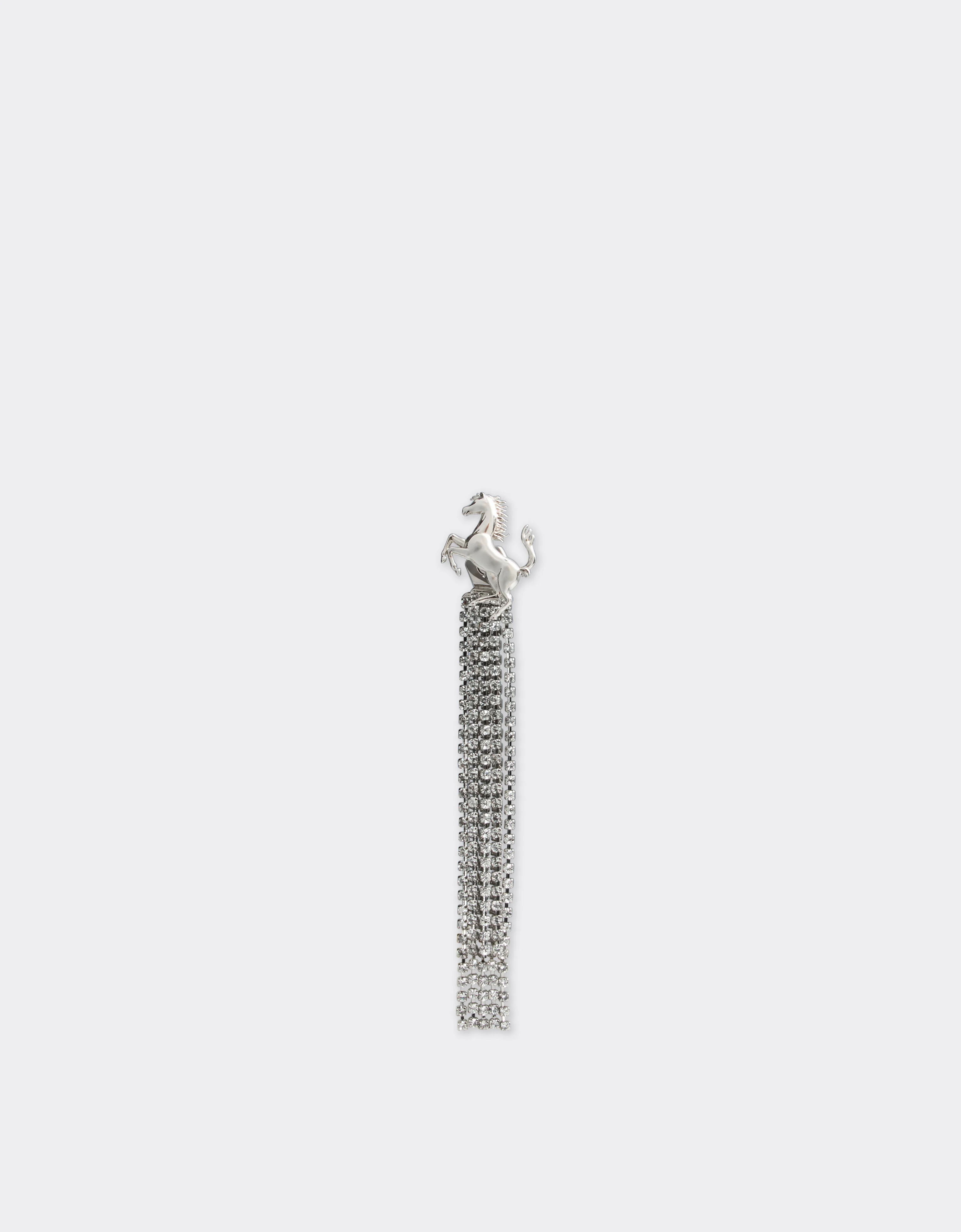 The metal drop earrings with a polished finish reinterpret Ferrari's distinctive elegance with a bold, contemporary twist. The Prancing Horse, the brand's iconic emblem, is set in a bow embellished with eight rows of rhinestones of varying lengths, creating a refined play of light and movement. The sparkling effect of the rhinestones enhances the purity of the lines and gives the accessory a sophisticated personality, perfect for completing elegant looks and enhancing special occasions. DETAILS - Transparent rhinestones - Prancing Horse MATERIALS PR: BRASS-VA:100.0 Product Code: 50182f142