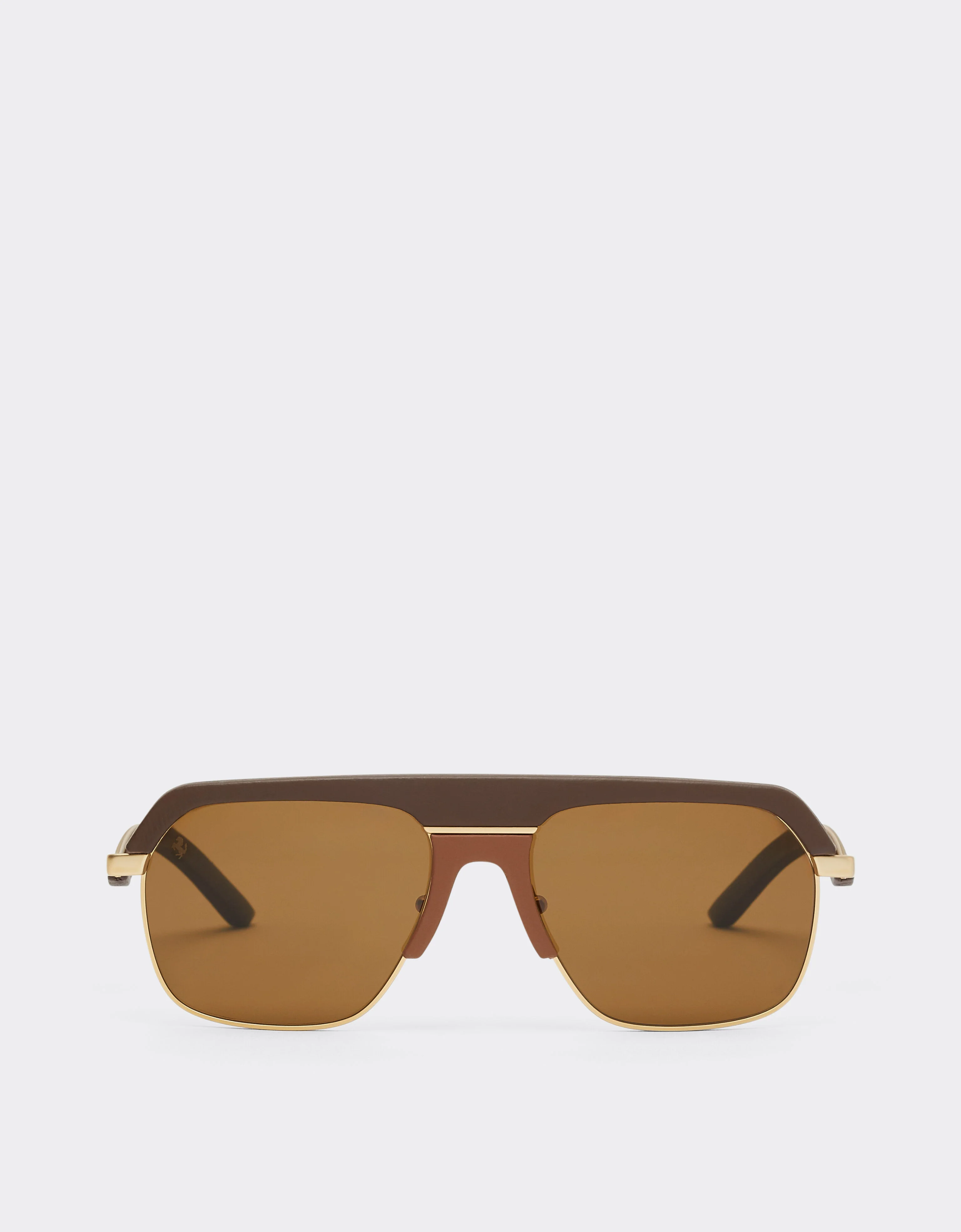 The meeting of fine materials gives rise to this contemporary interpretation of the pilot model, in which the timeless appeal of leather is combined with the elegance of sculpted metal. The leather details, precisely applied to the upperprofile, bridge and temples, recall the interiors of the Maranello company's cars and suggestions of the latest Ferrari catwalks. Barberini® glass lenses and the laser-engraved Prancing Horse complete the design, combining craftsmanship care and distinctive character. DETAILS - Pillow shape . - Metal and leather - Leather color: dark brown - Lenses color: matte gold - Lens color: brown - Polarized lenses - Lens/bridge size: 56/17 mm - Length of temples: 140 mm - Rampant Horse on the lens . - Ferrari logo on the temple - Exclusive packaging with custom box, case, pouch and microfiber cloth MATERIALS PR: ME-VA:100.0 Product Code: LA0ERf38