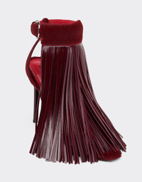 Sandals in a sophisticated mix of cowhide and wet-effect leather, enhanced with long flowing fringes – a symbol of timeless, bold and surprising elegance, distinctive of Ferrari's aesthetics. The detachable fringes lend versatility to this Italian-made sandals. The patch with logo label on the heel highlights attention to detail while the padded insole ensures superior comfort. DETAILS - Narrow square toe - Upper with rounded strap - Ankle strap with logo buckle and detachable fringes - Leather sole with non-slip injection and Cavallino metal rivet - Patch pad with logo label - Padded insole - Heel height: 10.5 cm MATERIALS PR: CALF LEATHER-VA:100.0 Product Code: 49742f163