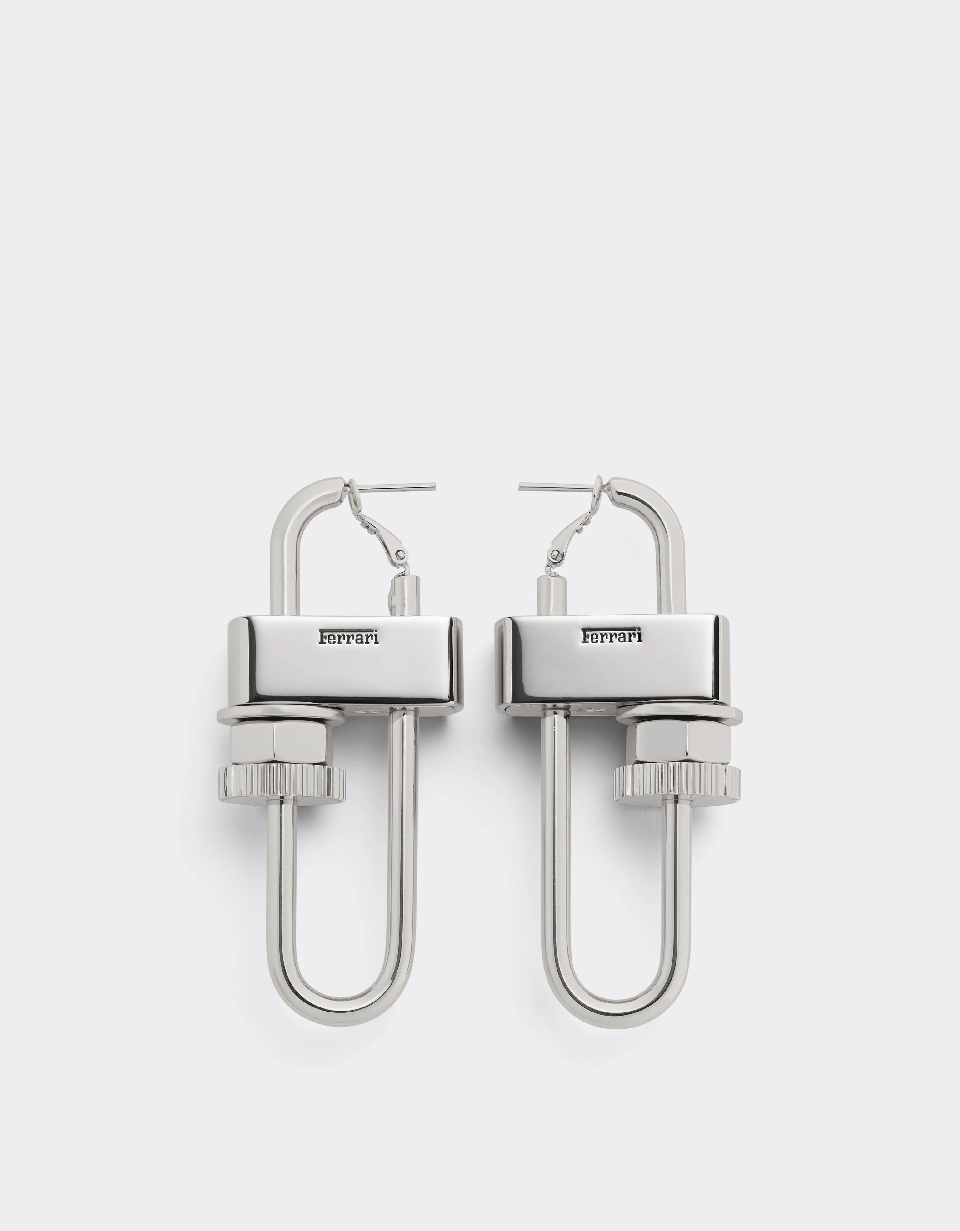 Brass and aluminum earrings with a polished chrome finish, inspired by the imagery of the Ferrari workshop. The design, which echoes the lines of a key ring, transforms a functional object into a style statement, where industrial rigor and artisan sensitivity coexist in perfect balance. Created through a meticulous process, cast, molded, bent, and finished with extreme care, they express a contemporary vision in which matter becomes gesture and function becomes ornament. DETAILS - Polished chrome finish - Pin closure - Dimensions: 7 cm x 3 cm - Engraved Ferrari logo MATERIALS PR: MEBRA:100.0 Product Code: 51179f142