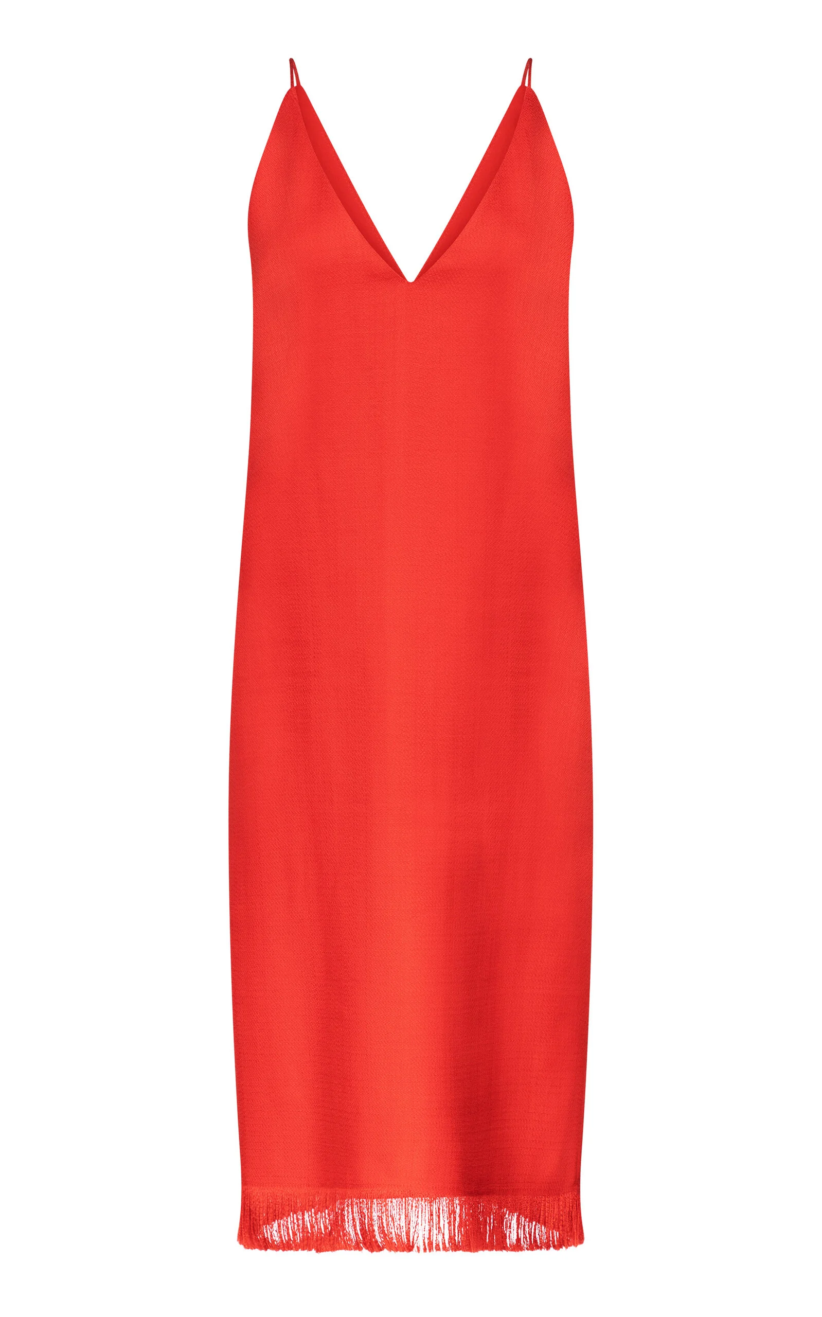 PRODUCT DETAILS - Slim fit, V neckline with petite straps, column silhouette - Pull Over - Unlined - Composition: 100% Viscose - Color: red - Dry Clean Only - Fall-Winter '25