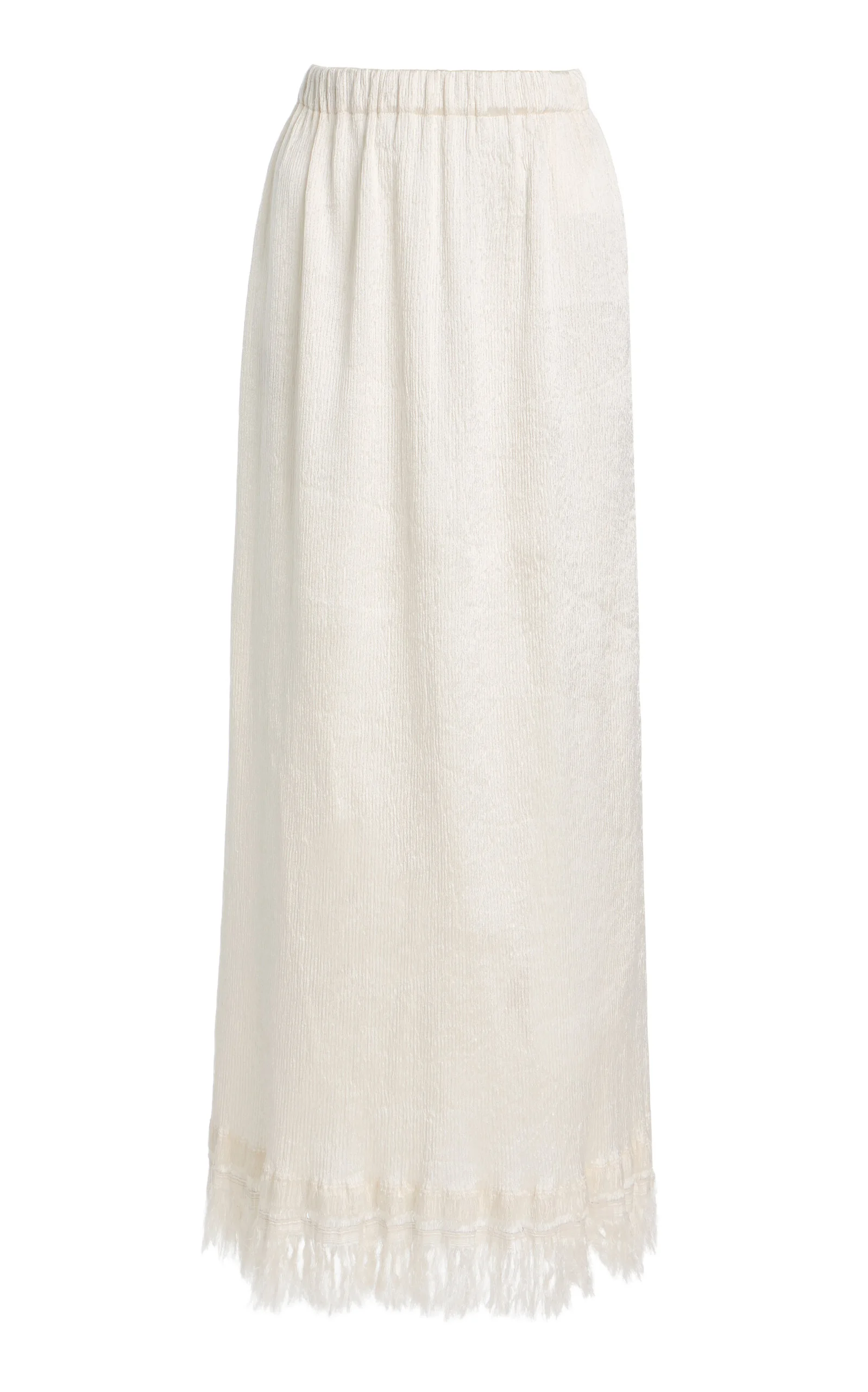 Founded in 2021 and based in New York, FFORME is born from the philosophy that luxury should reflect a modern sensibility. The house's obsessive attention to form and devotion to exceptional materials is expressed through a poetic lightness of touch and an avowed irreverence. The 'Coralie' pull-on skirt has a straight cut made from woven silk ottoman with a frayed hem. Pair yours with the matching tee. PRODUCT DETAILS - Resort '26 - Pull on - Composition: silk - Designer color: Cream - Dry clean - Imported SIZE & FIT - Our model is wearing a size IT 38 - Model is 5'10” with a 30" bust, 24" waist, and 34" hip