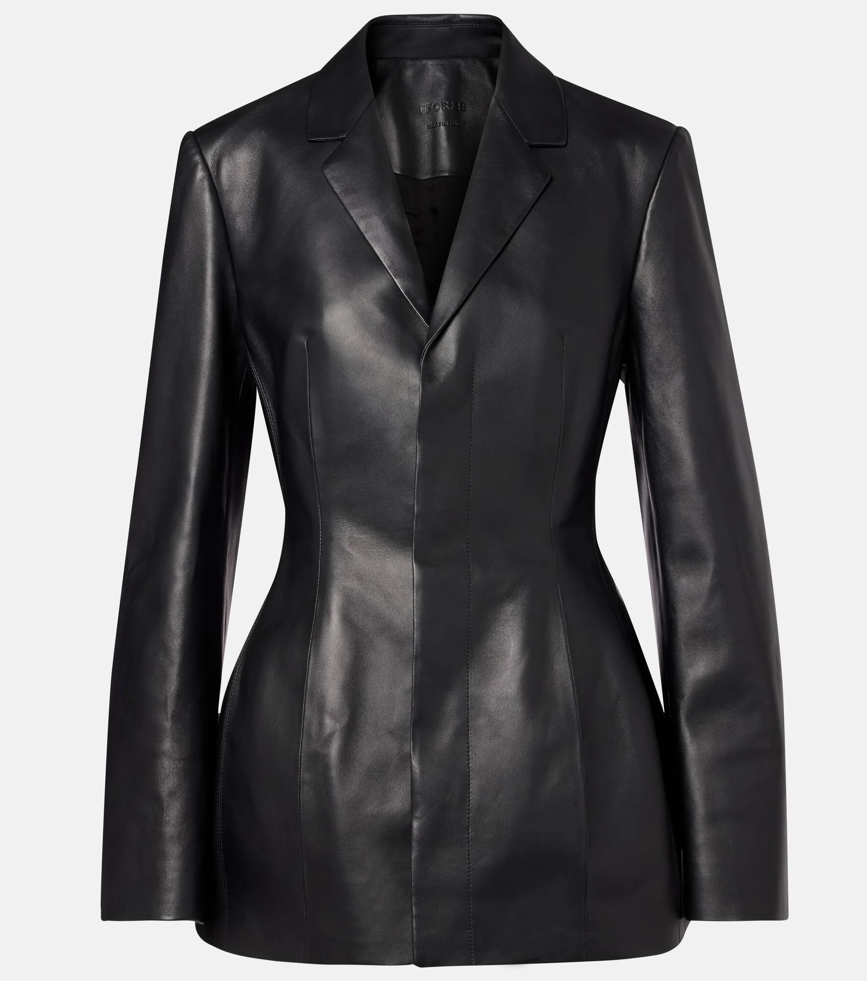 Fforme's leather blazer is made in Italy with a fitted silhouette and notched lapel. Lined for structure, the design features a concealed buttoned front, reflecting the brand’s focus on precise, architectural tailoring. Product Details - Material: 100% lamb leather - Care instructions: specialist clean - Made in Italy - Designer color name: Black - Item color: black - Lining: 100% cupro - Closure: concealed buttoned front - Notched lapel - Item number: P01052625 Size & Fit - True to size - Shoulder pad inserts - Cinched waist - Non-stretchy fabric - Falls below the hip - The model seen in the picture is 178cm-5'10" and wearing a size IT 40