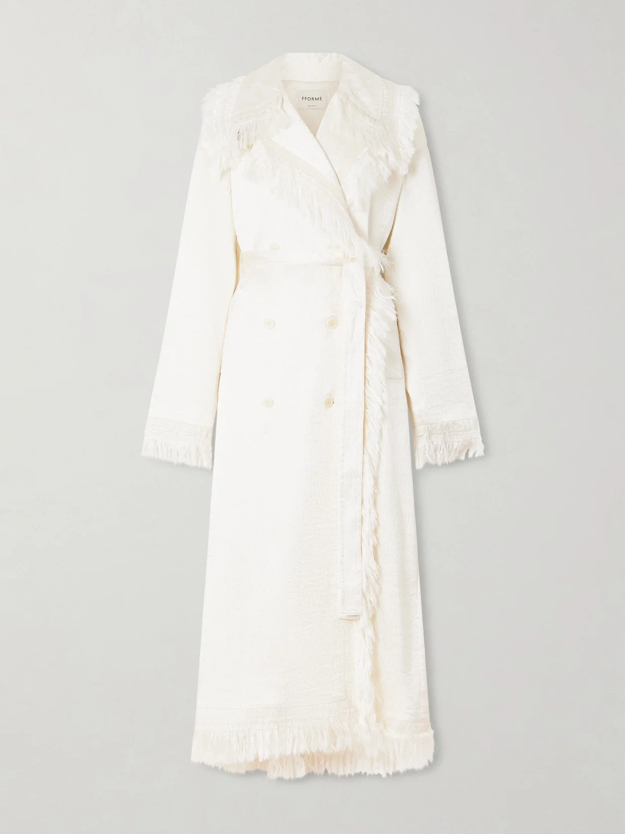 FFORME's ‘Lise' trench is the perfect example of how a coat can make or break your look, with no concern here over the latter. Tailored from a pale cream silk-blend, it has a relaxed double-breasted silhouette and runway-approved fringing.