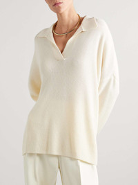 EDITORS'NOTES Elevated, high-quality knitwear like this 'Louise' sweater is a FFORME specialty. Made from soft merino wool and cashmere-blend for a slightly loose fit, it has a finely ribbed finish and a chic polo collar. Wear yours with everything from jeans to neutral tailoring. SIZE & FIT Model measurements: - Fits true to size, take your normal size - Intended for a slightly loose fit - Lightweight knit - Model is 177cm/ 5'10" and is wearing a size Small - Bust: 79cm/ 31" - Waist: 61cm/ 24" - Hip: 85cm/ 33.5" DETAILS & CARE - Off-white merino wool and cashmere-blend - Slips on - 90% merino wool, 10% cashmere - Dry clean
