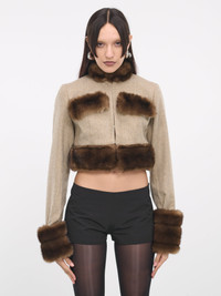 FIDAN NOVRUZOVA jacket in brown & beige, paneled construction, faux fur trim throughout, stand collar, front concealed hook & eye closure, long sleeves, straight hem, cropped length, fitted. Made in Moldova Standard Sizing Model is 5'8" wearing size S. Bust: 32" Waist: 26" Hips: 34.5"