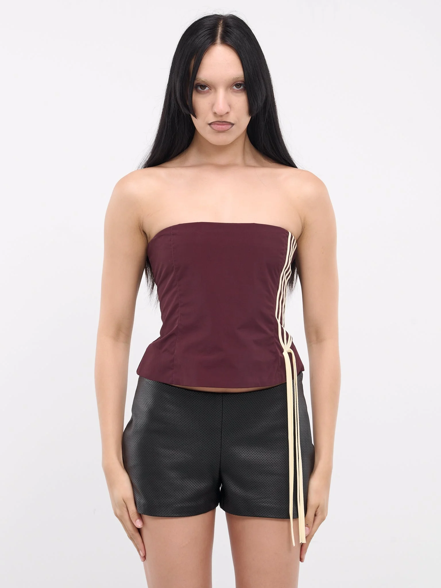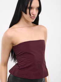 FIDAN NOVRUZOVA tube top in burgundy, paneled nylon construction, straight neckline, strapless, back exposed zip closure, side piping & extended trim, curved hem, slim fit. Made in Moldova 100% Polyamide Standard Sizing Model is 5'8" wearing size S. Bust: 32" Waist: 26" Hips: 34.5"