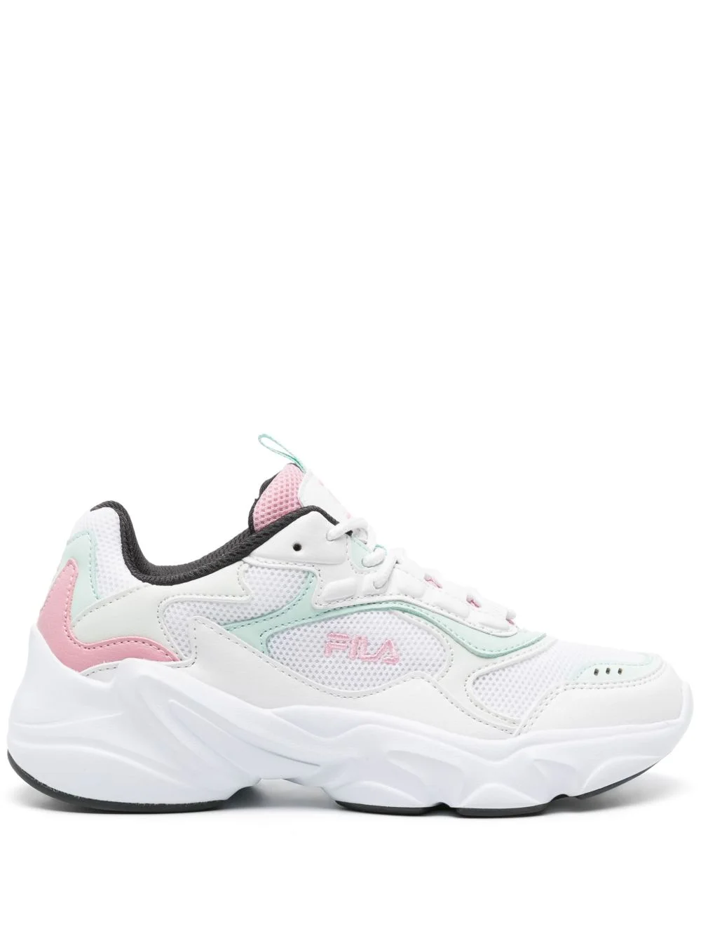 Collene panelled chunky sneakers Highlights - White/mint green - Multi-panel design - Micro-mesh panels - Faux-leather panels - Logo patch at the tongue - Embroidered logo to the side - Embossed logo to the rear - Pull-tab at the tongue - Front lace-up fastening - Round toe - Branded insole - Chunky rubber sole Imported Composition Other fibres 100% SIZE & FIT Measurement HEEL 1.18 in(3 cm) Sole height 0.59 in(1.5 cm)
