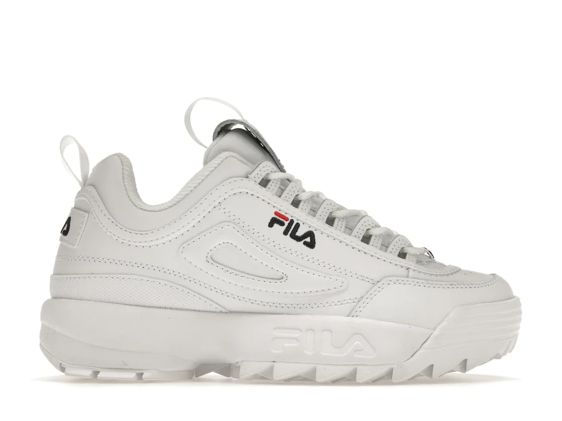 The Fila Disruptor 2 White Navy Red W is a stylish and comfortable sneaker that is perfect for everyday wear. The shoe features a white leather upper with navy and red accents, giving it a classic and timeless look. The chunky sole provides excellent cushioning and support, making it ideal for long walks or runs. The Fila Disruptor 2 White Navy Red W was released on February 16, 2018, and has since become a popular choice among sneaker enthusiasts. The retail price for this shoe is $65, making it an affordable option for those looking for a high-quality sneaker. One of the standout features of the Fila Disruptor 2 White Navy Red W is its unique design. The combination of white, navy, and red creates a bold and eye-catching look that is sure to turn heads. Additionally, the chunky sole adds a touch of retro style that is both trendy and comfortable. Something we love about the Fila Disruptor 2 White Navy Red W is its versatility. This shoe can be dressed up or down, making it a great choice for any occasion. Whether you're running errands or going out for a night on the town, the Fila Disruptor 2 White Navy Red W is sure to keep you looking stylish and feeling comfortable. - Style 5FM00002-125 / 1010302-1FG - Colorway White/Fila Navy-Fila Red - Retail Price 65 - Release Date 2018-02-16 - Featured false
