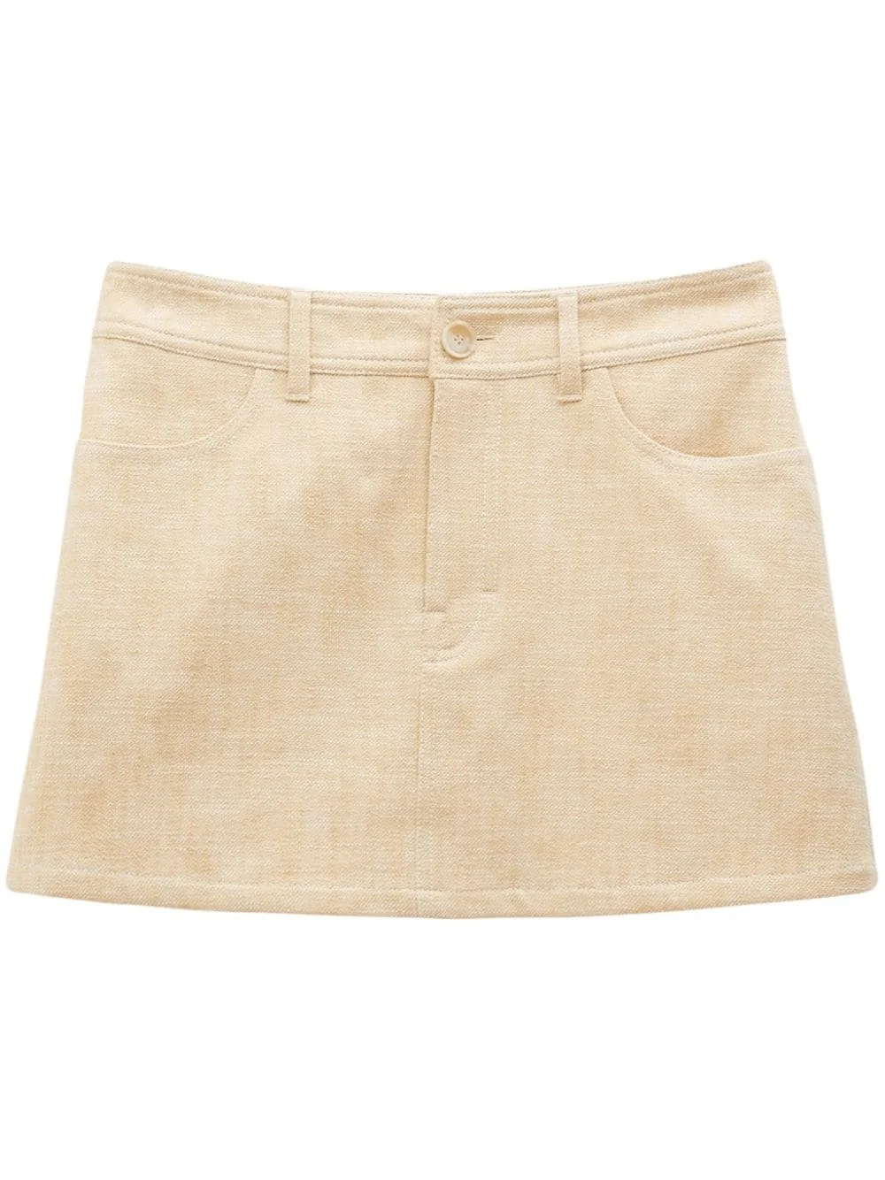 A-line cotton-blend miniskirt Highlights - Beige - Cotton blend - Belt loops - A-line - Front button fastening - Slip pockets to the sides - Thigh-length - Straight hem Imported Composition Cotton 88%, Polyester 10%, Spandex/Elastane 2%