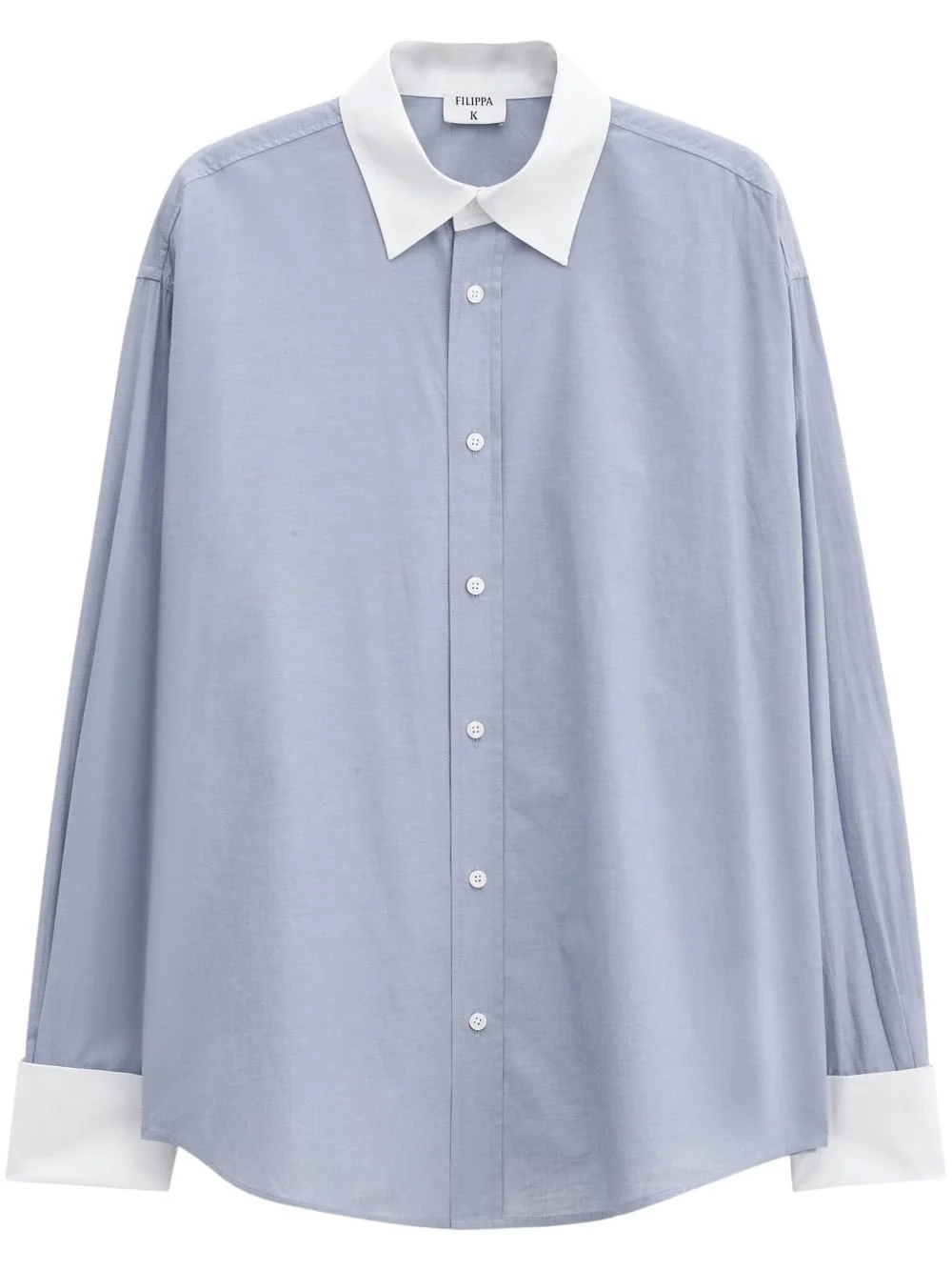 cotton tuxedo shirt Highlights - Steel blue/white - Poplin texture - Front button fastening - Cutaway collar - Long sleeves - Buttoned cuffs - Contrasting collar and cuffs - Curved hem Imported Composition Organic Cotton 100% Washing instructions Machine Wash