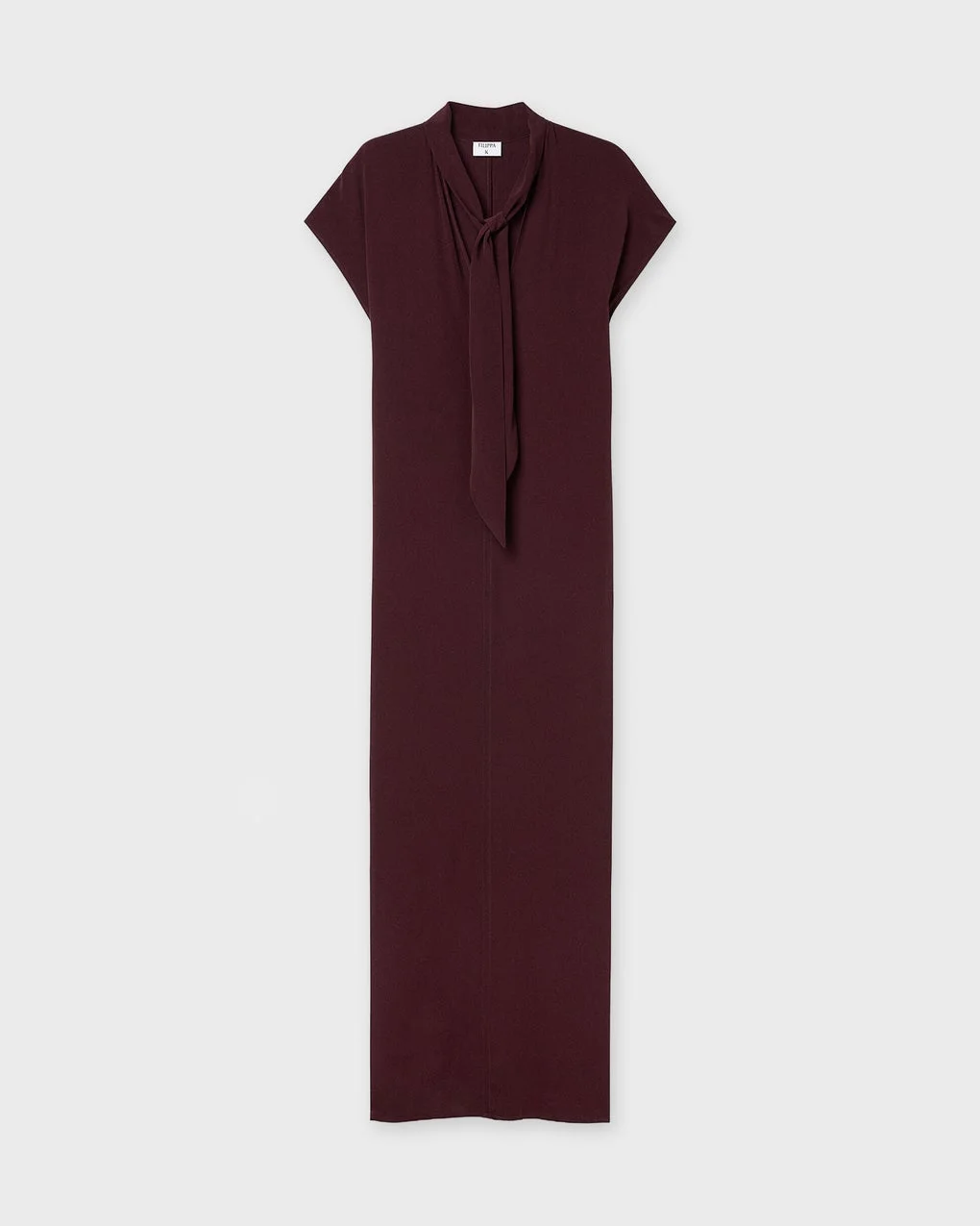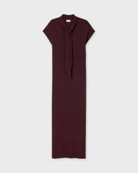 Long Tie-Neck Dress from Filippa K. A relaxed-fit maxi dress draped in a lightweight, matte Naia acetate blend. Features a V-neckline, a tie detail at the neck, and a side slit. Size and Fit - The model is 176 cm tall and is wearing size 36 Specification - Article number - ID: 176847-350 - Brand: Filippa K - Color: Burgundy - Washing Instructions: Dry clean - Made of: 64% Acetate (Naia), 36% Viscose