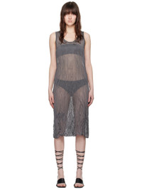 Semi-sheer crinkled knit viscose-blend dress. · Metallic thread detailing throughout · Rib knit scoop neck and armscyes Supplier color: Dark grey 75% viscose, 25% steel. Made in Romania 241072F054002