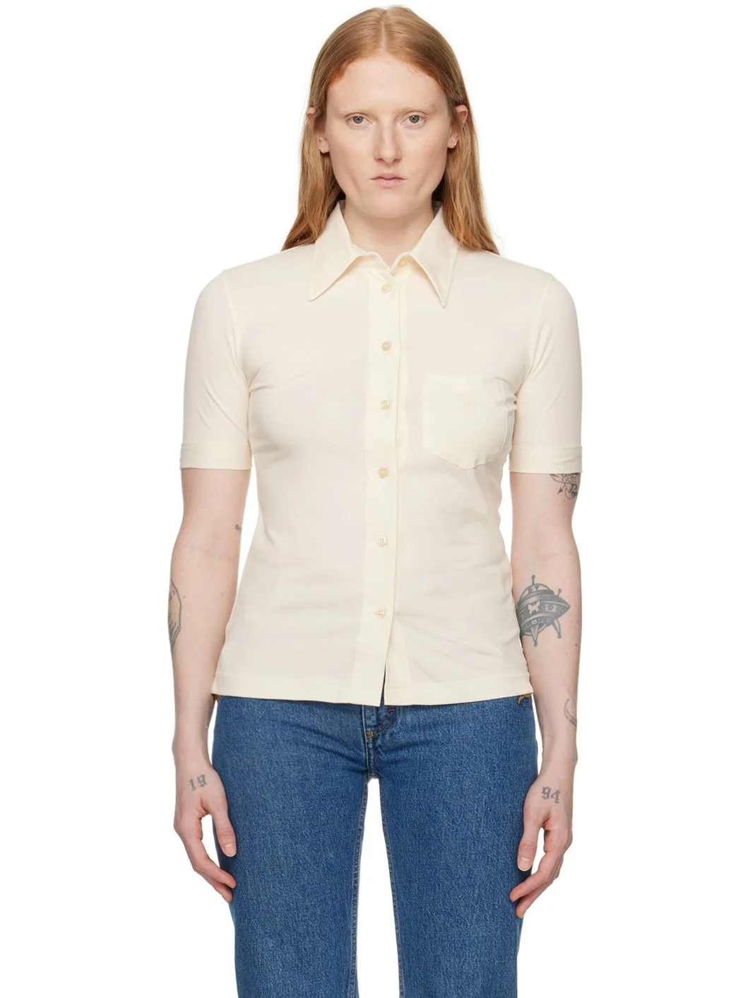 Stretch organic cotton jersey shirt. · Spread collar · Button closure · Text embroidered at patch pocket · Rolled cuffs Part of the 1993 collection. Supplier color: Ivory 90% organic cotton, 10% elastane. Made in Portugal 241072F109010