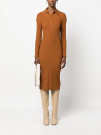 ribbed jersey polo dress Highlights - Camel brown - Jersey knit - Ribbed knit - Polo collar - Front button placket - Long sleeves - Bodycon design - Below-knee length Imported Composition Cupro 95%, Elastane 5% SIZE & FIT Model measurements Height 5 ft 10 in(1.77 m) Bust/Chest 29.92 in(76 cm) Hips 34.25 in(87 cm) Waist 23.62 in(60 cm) FittingInformation Designed for a slim fit that sits just away from the body offering a close yet comfortable fit Made with a midweight knit, this piece offers some stretch This piece fits true to size – take your usual size Washing instructions Hand Wash