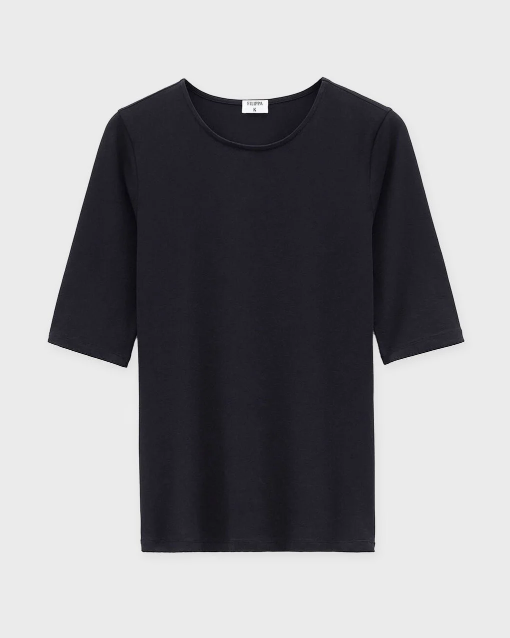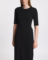 T-Shirt Cotton Stretch Elbow Sleeve from Filippa K. Stylish top made of OCS-cotton. The top is designed with a round neckline and elbow length sleeves. Stretchy and soft material. The perfect garment for your wardrobe essentials. Size and Fit - Fits true to size, choose your usual size - The model is 176 cm tall and is wearing size S Specification - Article number - ID: 170245-000 - Brand: Filippa K - Color: Black - Washing Instructions: Mashine wash cold - Made of: Made of 90% Cotton (organic), 10% Elastane