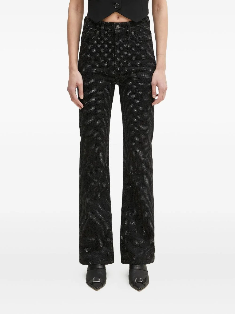 crystal-embellished flared jeans Highlights - Black - Rhinestone embellishment - Flared leg - High waist - Five pockets - Button fly Made in United Kingdom Composition Cotton 100% Washing instructions Read Manufacturer Guidelines