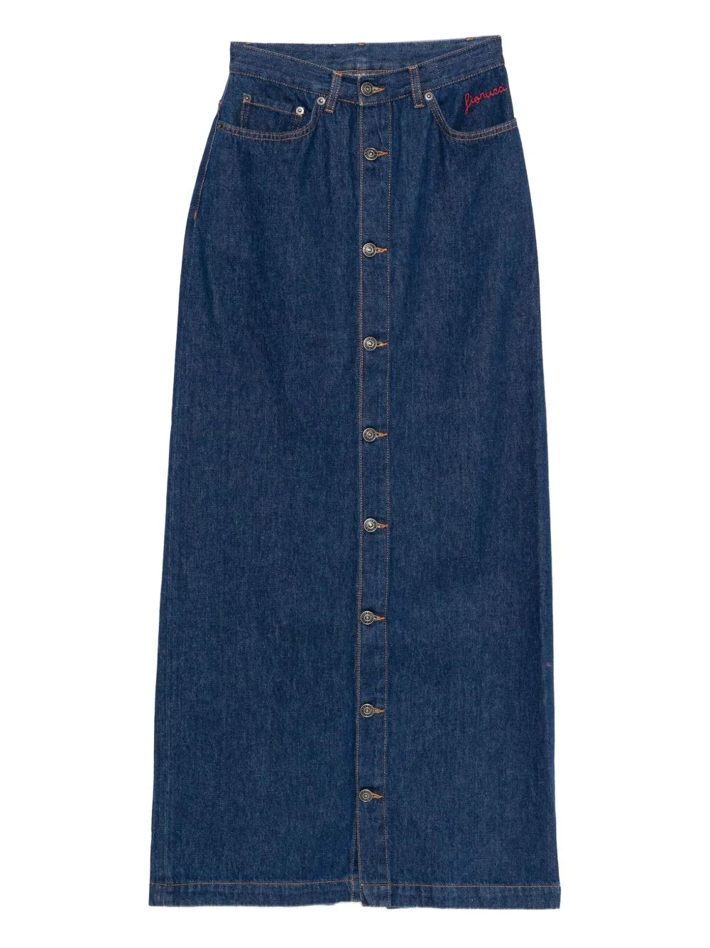 button-front denim skirt Highlights - Blue - Denim - Front button fastening - Embroidered logo - High waist Made in Italy Composition Cotton 100% SIZE & FIT Model measurements Height 5 ft 9 in(1.76 m) Bust/Chest 32.28 in(82 cm) Hips 35.43 in(90 cm) Waist 25.19 in(64 cm) Washing instructions Machine Wash