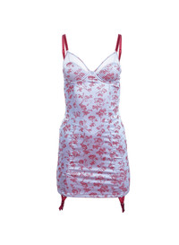 Power play. Our Rose Jacquard Bebe Slip Dress. Features bottom molded underwire cups with topstitch detailing and sheer tulle panels. Sexy mini length with garter straps at hem. Adjustable straps. Pair with the matching Rose Jacquard Top Stitch Thong and Sheer Thigh High Stocking. Materials & Care - Body: 88% Polyester & 12% Elastane - Combo: 85% Polyamide & 15% Elastane - Lining: 79% Polyamide & 21% Elastane - Dry clean or hand wash cold & lay flat to dry. - SKU: SL0143-0974 Size & Fit - Model is 5'11 and wearing a size 4. - Center front to hem measures approx 22” in length.
