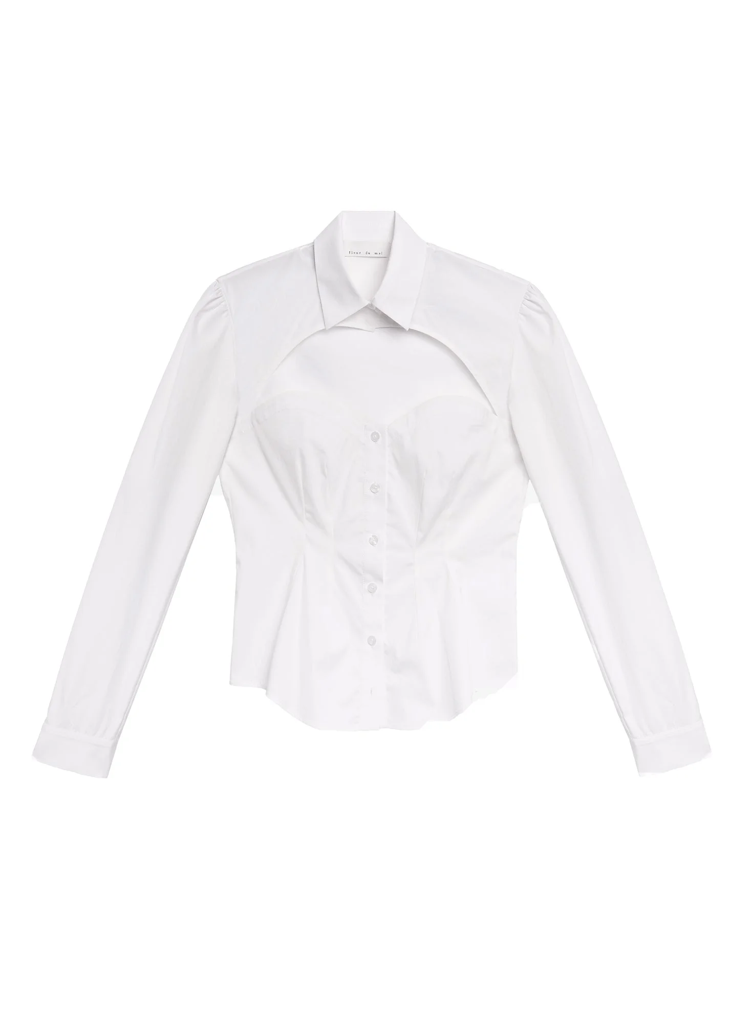 Give your decollete the attention it deserves. Our Bella Shirt features cutout chest with a sweetheart neckline and collar button detail. Ultra flattering princess seaming to add shape. Pair with the Tuxedo Shorts or your favorite jeans for a chic and sexy day to night look. Materials & Care - Body: 97% Cotton & 3% Polyurethane - Dry clean only - SKU: TP0347-0300 Size & Fit - Model is 5'9 and wearing a size 2.
