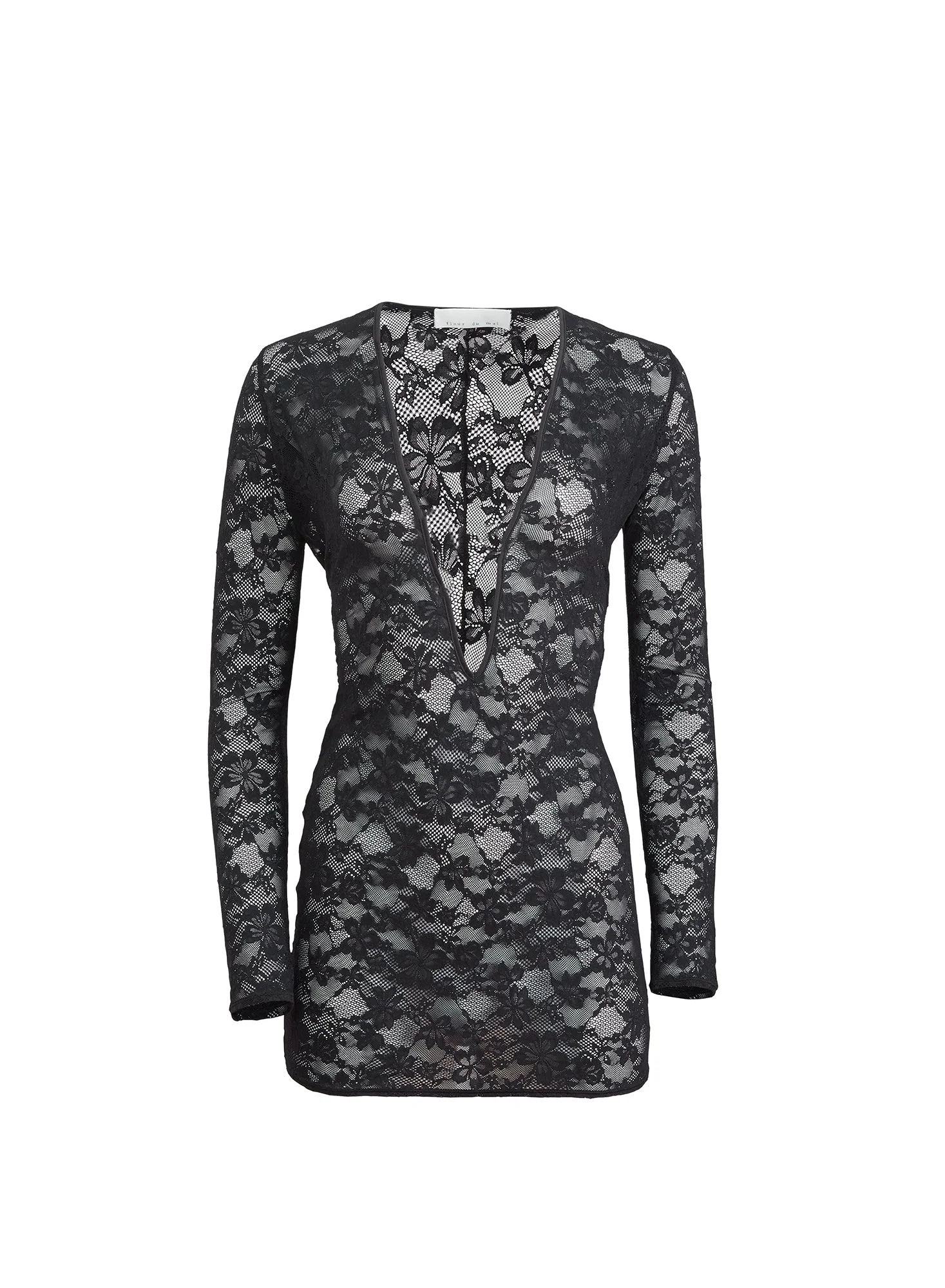 Our Le Stretch Lace Plunge Mini Dress, cut from ultra comfortable 4-way stretch lace with deep v-neckline. Unlined, designed to be fitted. Layer yours over the matching Le Stretch Lace Cheeky. Materials & Care - Body: 37% Nylon, 29% Recycled Nylon, & 34% Spandex - Combo: 95% Silk & 5% Elastane - Hand wash cold & lay flat to dry. Do not soak. - SKU: DR0552-0100 Size & Fit - Model is 5'11 and wearing a size S.