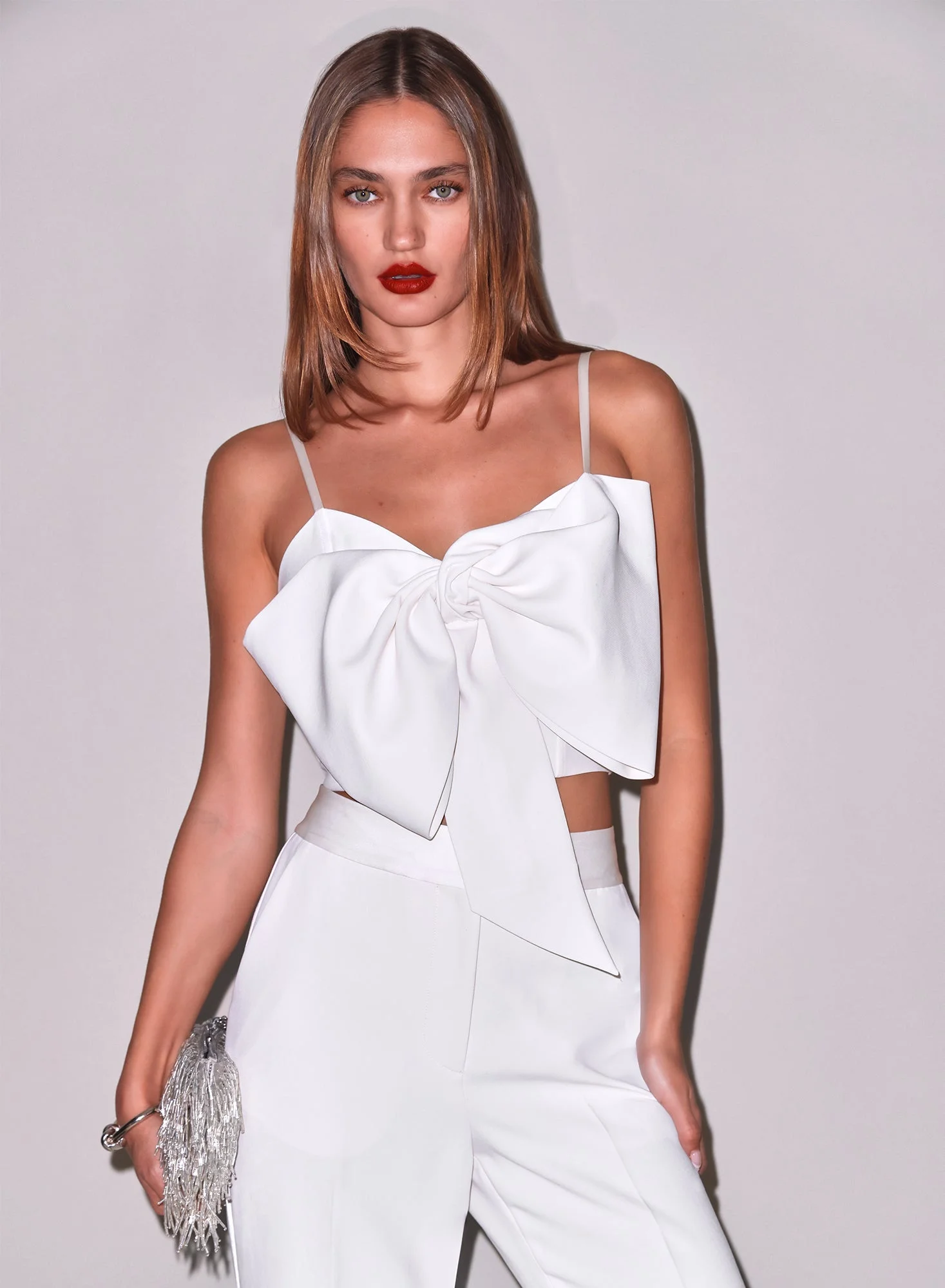 Our chic Blair Bow Top, featuring flattering cropped fit with boning and oversized front bow. Power mesh back with exposed zip closure. Take it out with the Tuxedo Pant. Materials & Care - Body: 100% Recycled Polyester - Combo 1: 92% Silk & 8% Elastane - Combo 2: 78% Nylon & 12% Spandex - Combo 3: 78% Nylon & 12% Spandex - Dry clean only - SKU: TP0721-0300 Size & Fit - Model is wearing a size Small.
