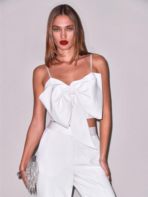 Our chic Blair Bow Top, featuring flattering cropped fit with boning and oversized front bow. Powermesh back with exposed zip closure. Take it out with the Tuxedo Pant. Materials & Care - Body: 100% Recycled Polyester - Combo 1: 92% Silk & 8% Elastane - Combo 2: 78% Nylon & 12% Spandex - Combo 3: 78% Nylon & 12% Spandex - Dry clean only - SKU: TP0721-0100 Size & Fit - Model is wearing a size Small.