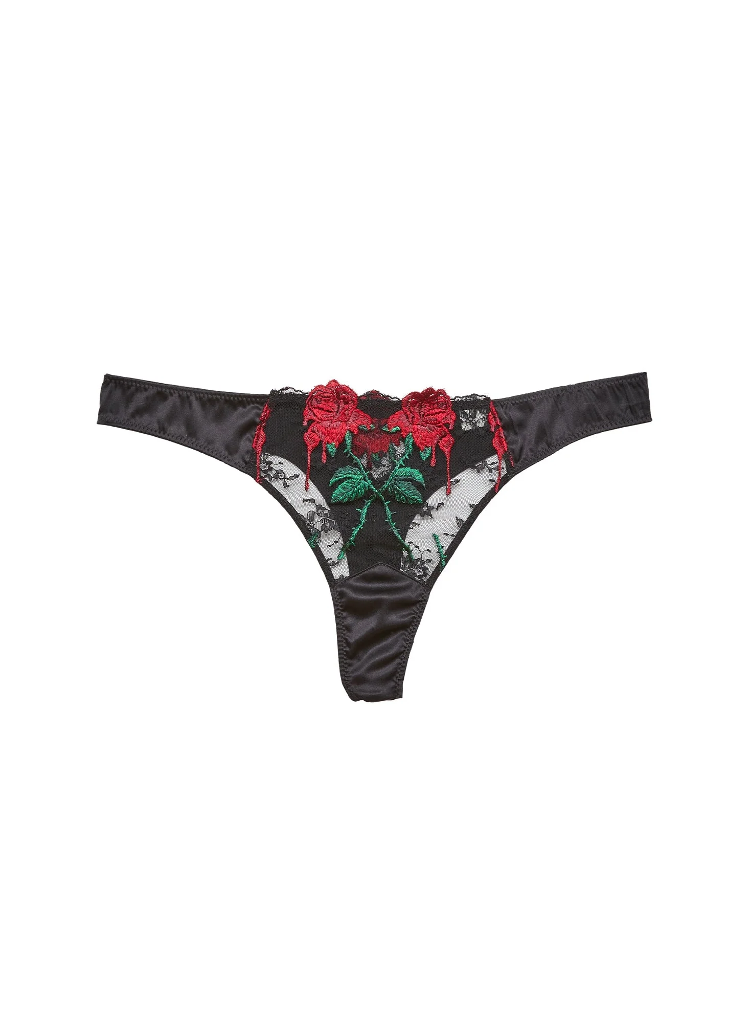 Bite me. Our Vampire Rose Embroidery Thong, featuring dripping rose embroidery on sheer lace. Luxe stretch silk and back embroidery detail. Complete this seriously sexy set with the matching Vampire Rose Embroidery Demi Bra and Garter Belt. Materials & Care - Body: 100% Polyamide - Combo: 92% Silk & 8% Elastane - Gusset: 100% Cotton - Hand wash cold & hang or lay flat to dry. Do not soak. - SKU: PY0483-0100-001 Size & Fit - Model is wearing a size 2, the equivalent to size Small.