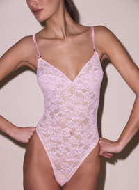 Work your body. Our Le Stretch Lace Wireless Bodysuit, cut from ultra comfortable 4-way stretch lace with triangle cups for a smooth, seamless finish. Features luxe silk adjustable straps, and snap bottom closure with thong cut back. Bottom cups lined with mesh for added coverage. Pair with trousers or flaunt on its own to make a statement at the bar or in the bedroom. Materials & Care - Body: 37% Nylon, 29% Recycled Nylon, & 34% Spandex - Hand wash cold, lay flat to dry - SKU: BS0425-0922 Size & Fit - Model is wearing a size Small.