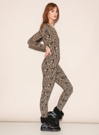 Apres-chic. Our stretch Knit Apres-Ski Catsuit, in custom butterfly leopard jacquard print. Luxe knit catsuit with ribbed cuffs and front zipper detail. Layer under your ski suit on the slopes, and then flaunt on its own at the chalet. Materials & Care - Body: 72% Viscose & 28% Polyester - Dry clean - SKU: JS0073-0840 Size & Fit - Model is 5'9 and is wearing a size S.